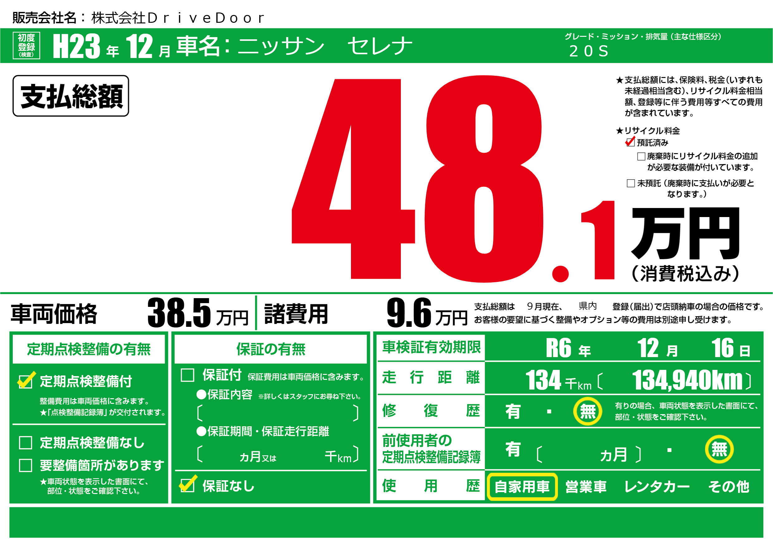 | 走行キロ | 13.4万km | 初年度登録 | H23年12月 |