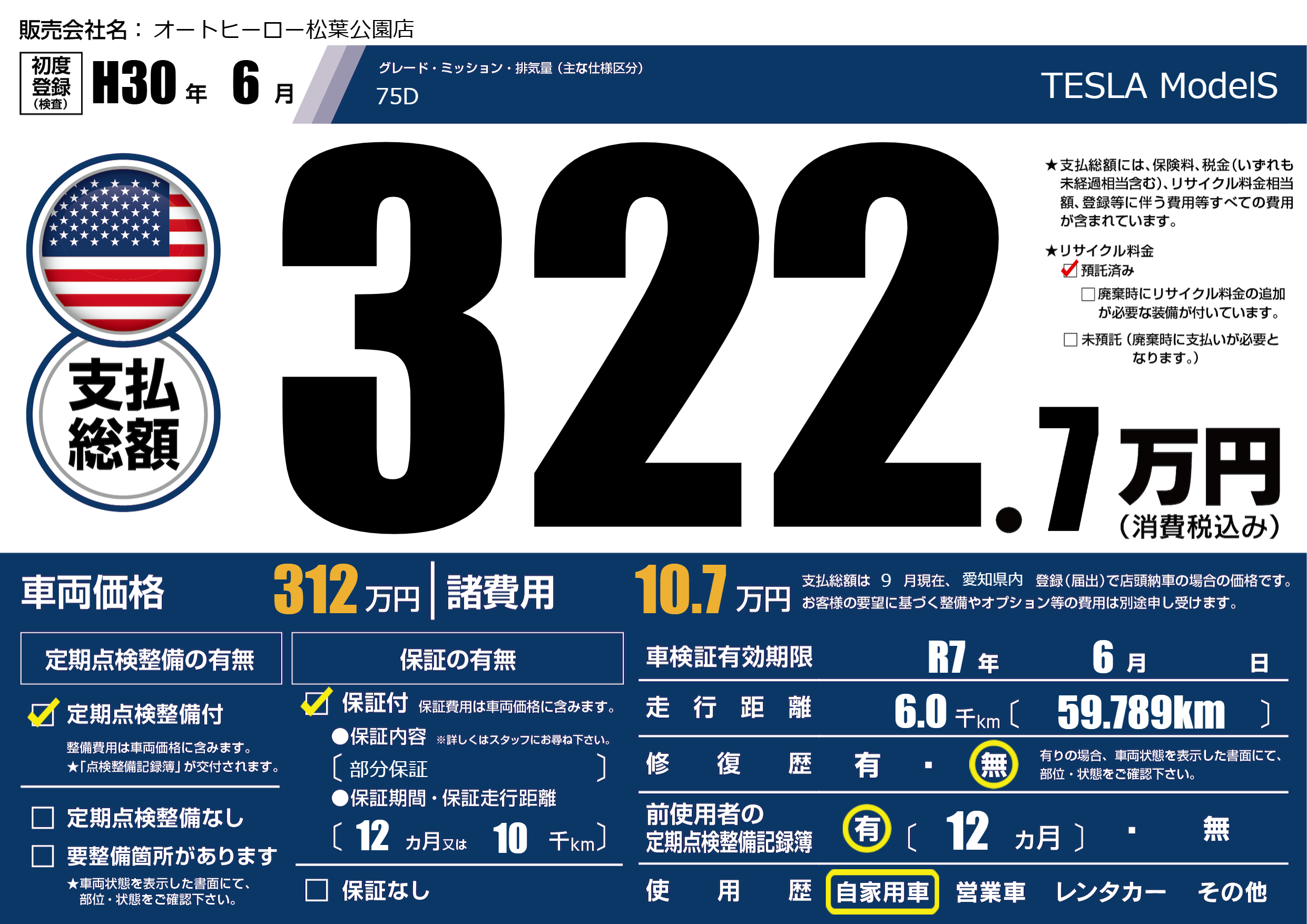 | 車名 | TESLA ModelS | グレード ミッション 排気量 |