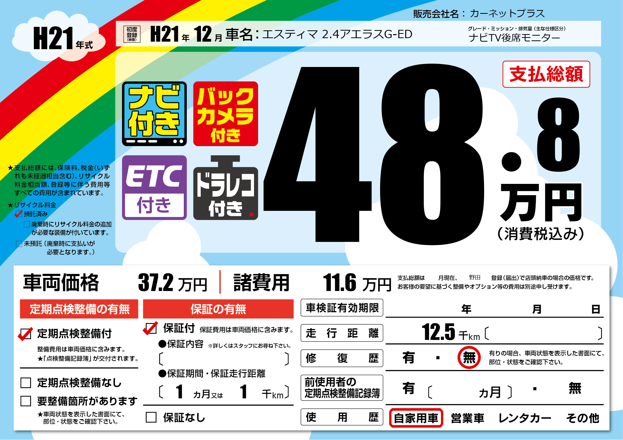 | 走行キロ | 1.2万km | 初年度登録 | H21年12月 |