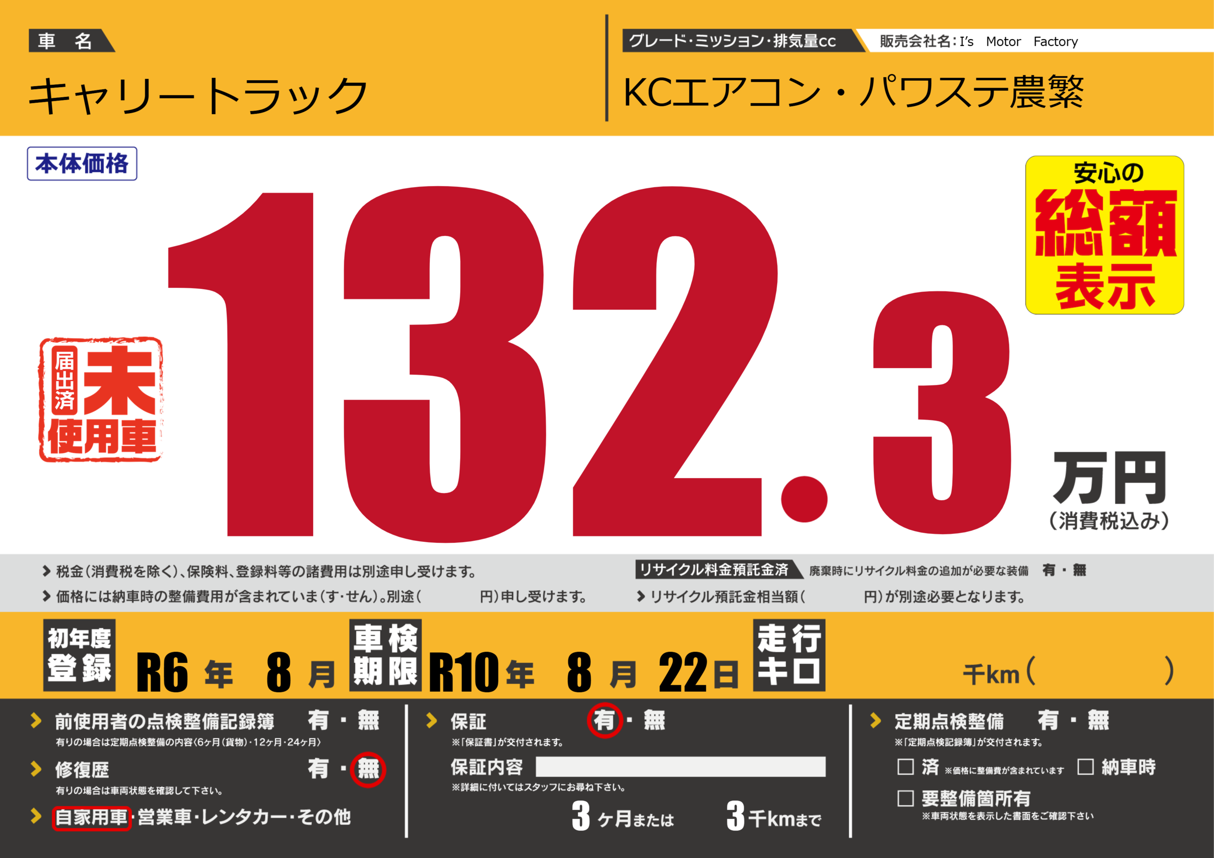 | 走行キロ | - | 初年度登録 | R6年8月 |