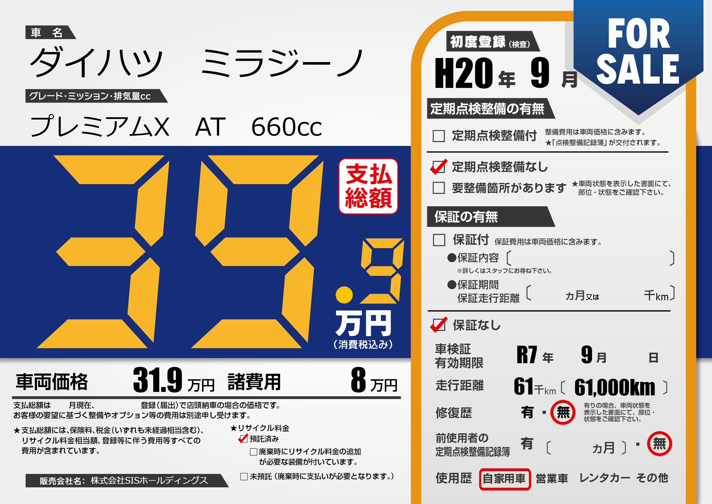 | 走行キロ | 6.1万km | 初年度登録 | H20年9月 |