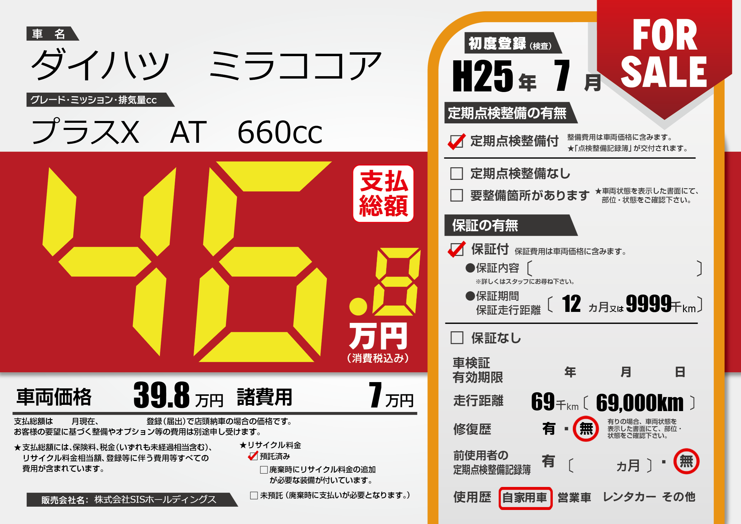 | 走行キロ | 6.9万km | 初年度登録 | H25年7月 |
