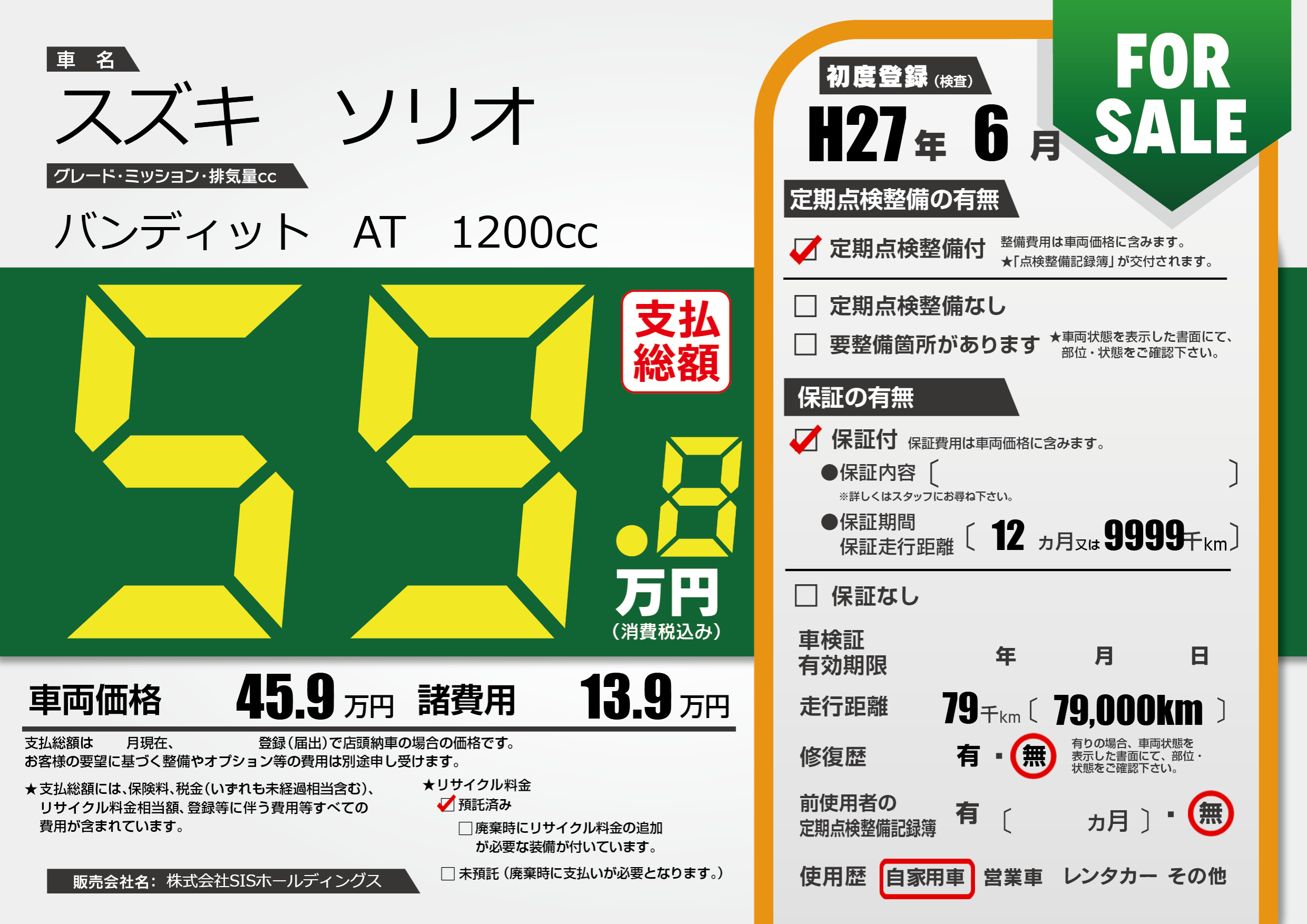 | 車名 | スズキ ソリオ | グレード ミッション 排気量 |