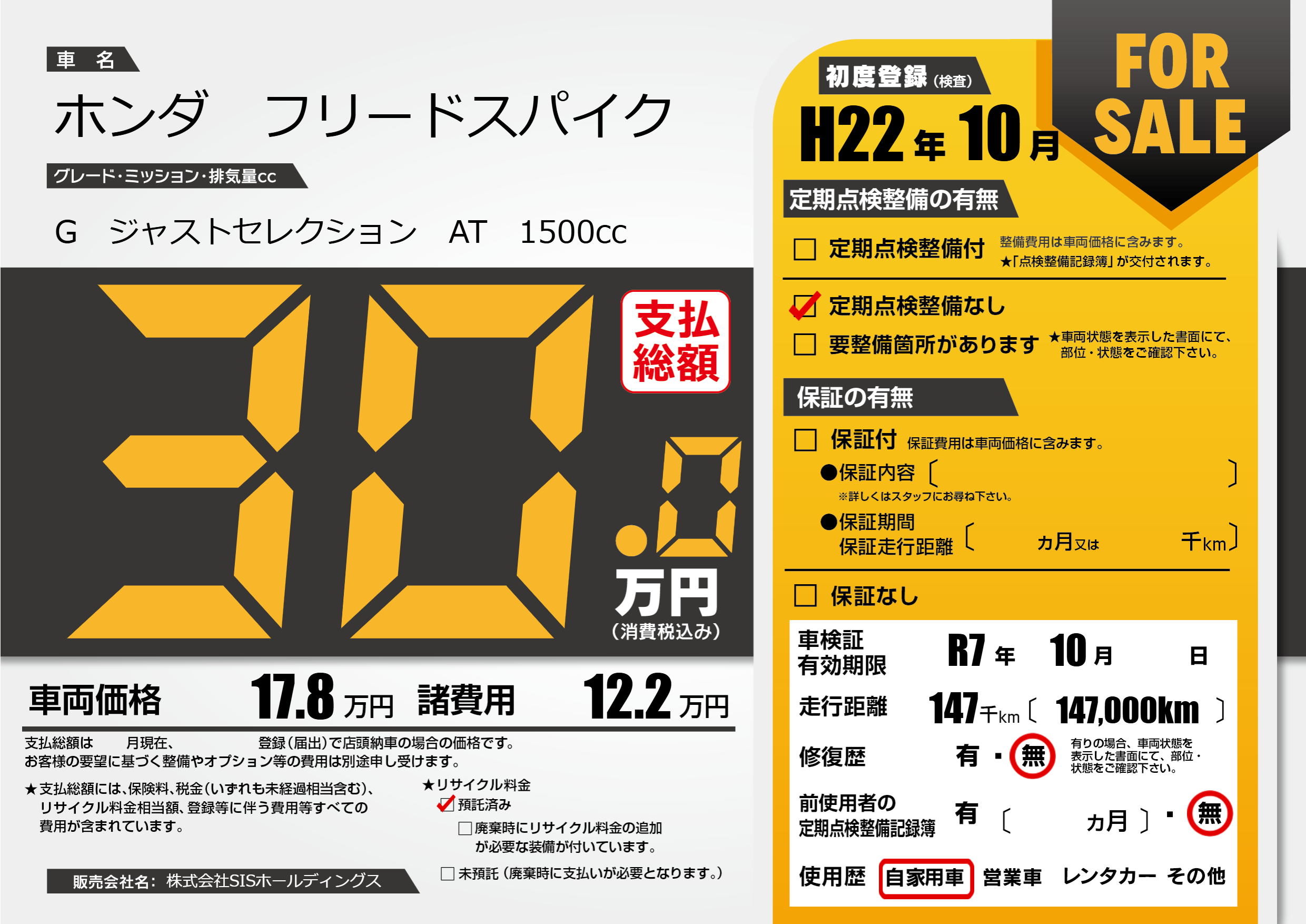 | 車検制限 | R7年 10月 - 日 | ||