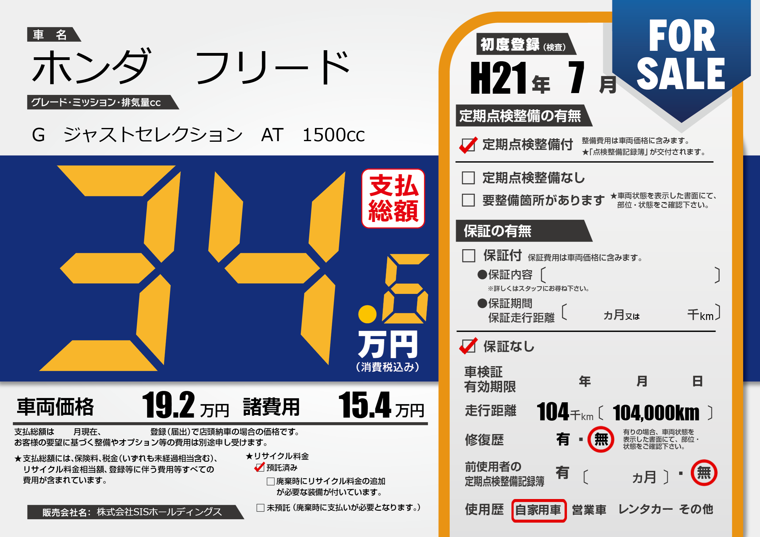 | 走行キロ | 10.4万km | 初年度登録 | H21年7月 |
