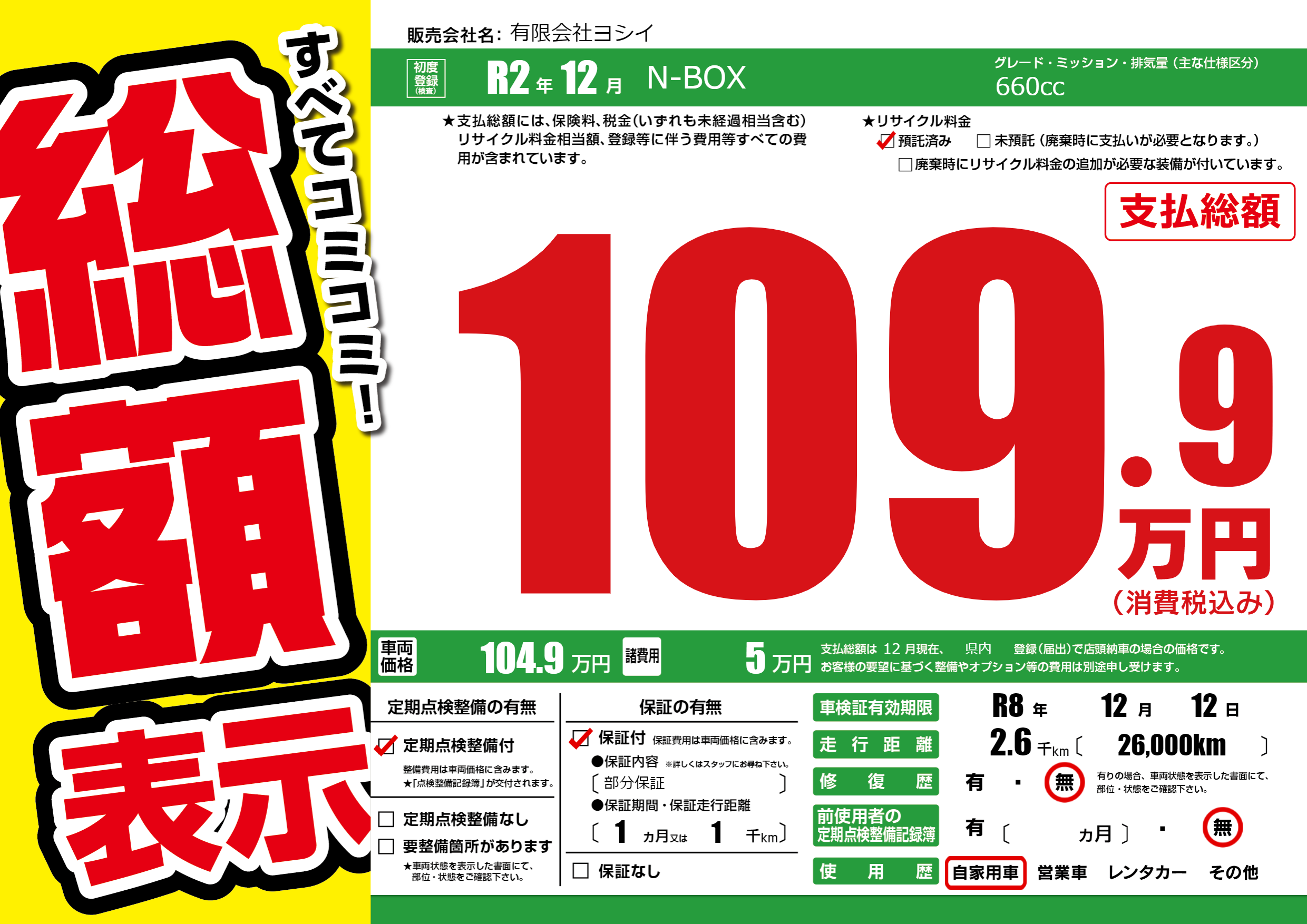 | 車名 | N-BOX | グレード ミッション 排気量 |