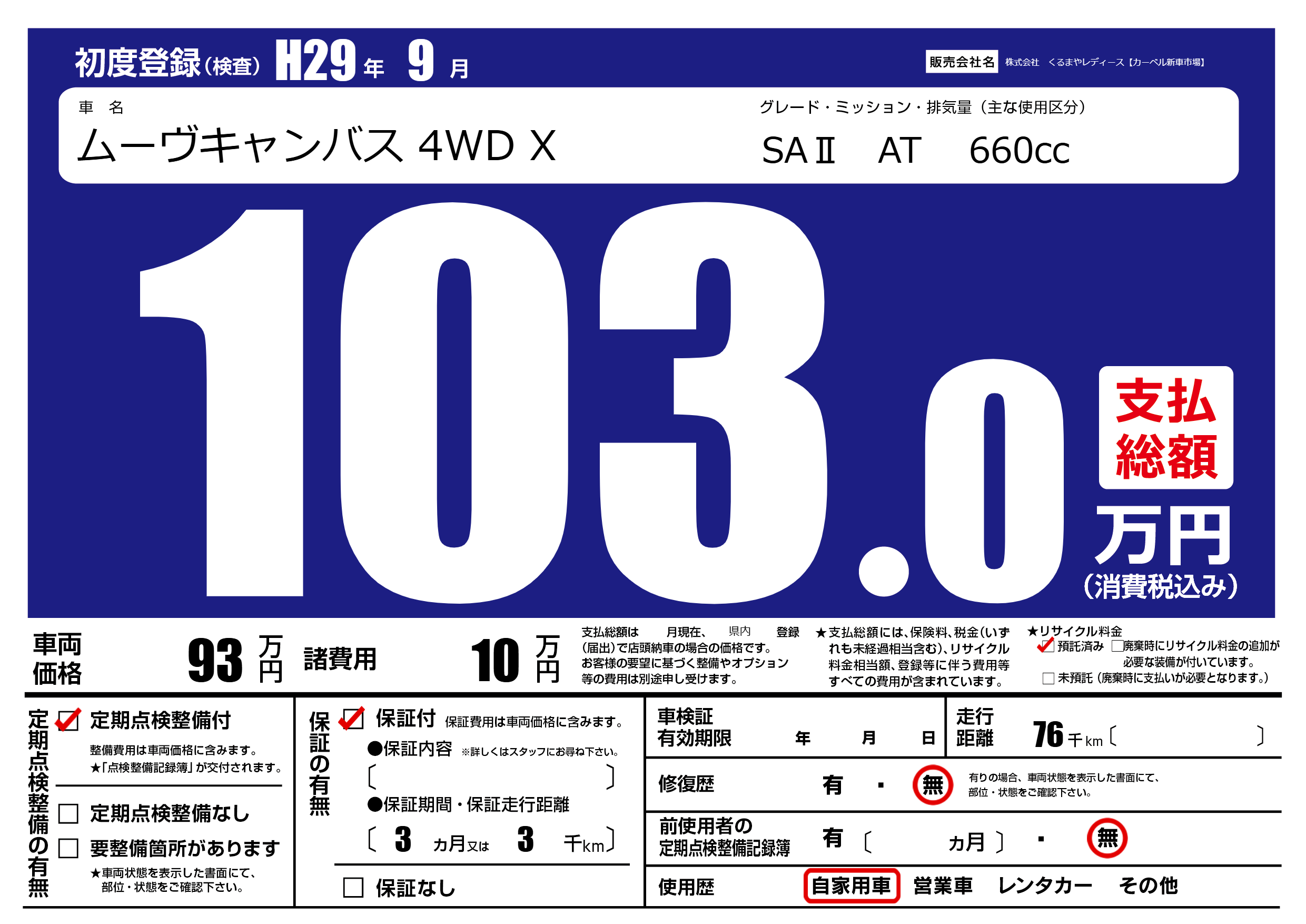| 車名 | ムーヴキャンバス 4WD X | グレード ミッション 排気量 |