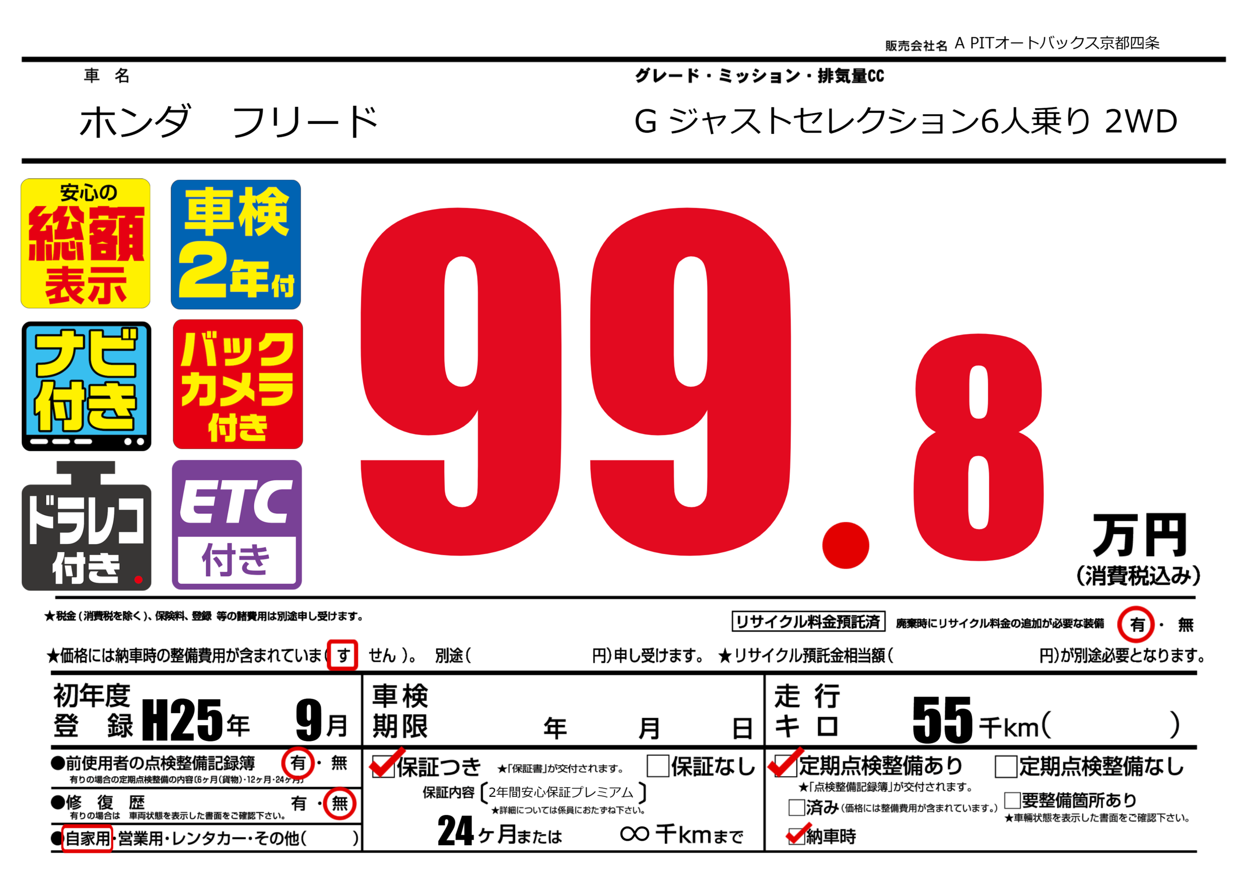 保証なし 保証内容(2年間安心保証プレミアム) 24ヶ月または(∞)千kmまで |