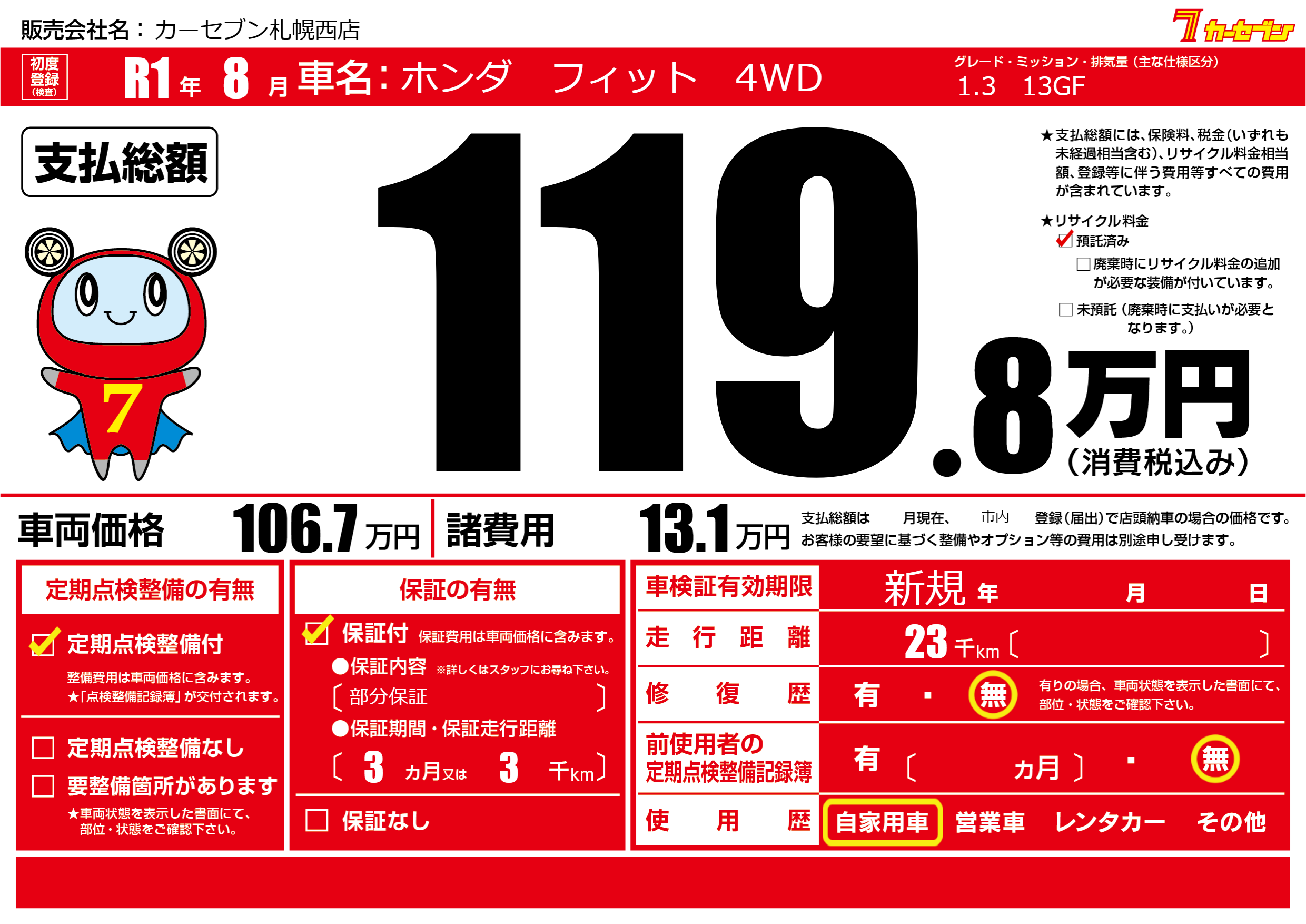 | 車名 | ホンダ フィット 4WD | グレード ミッション 排気量 |