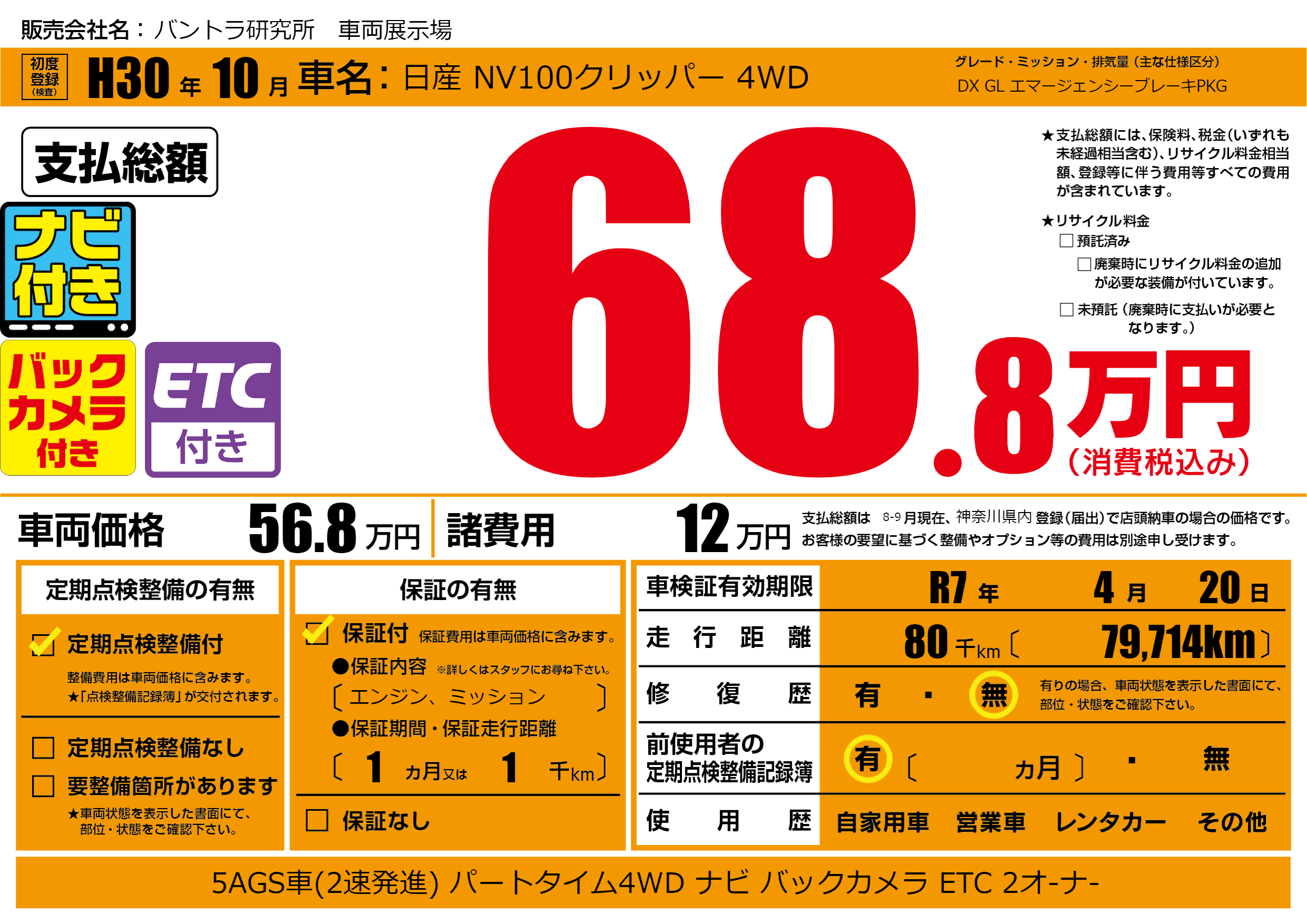 | 車名 | 日産 NV100クリッパー 4WD | グレード ミッション 排気量 |