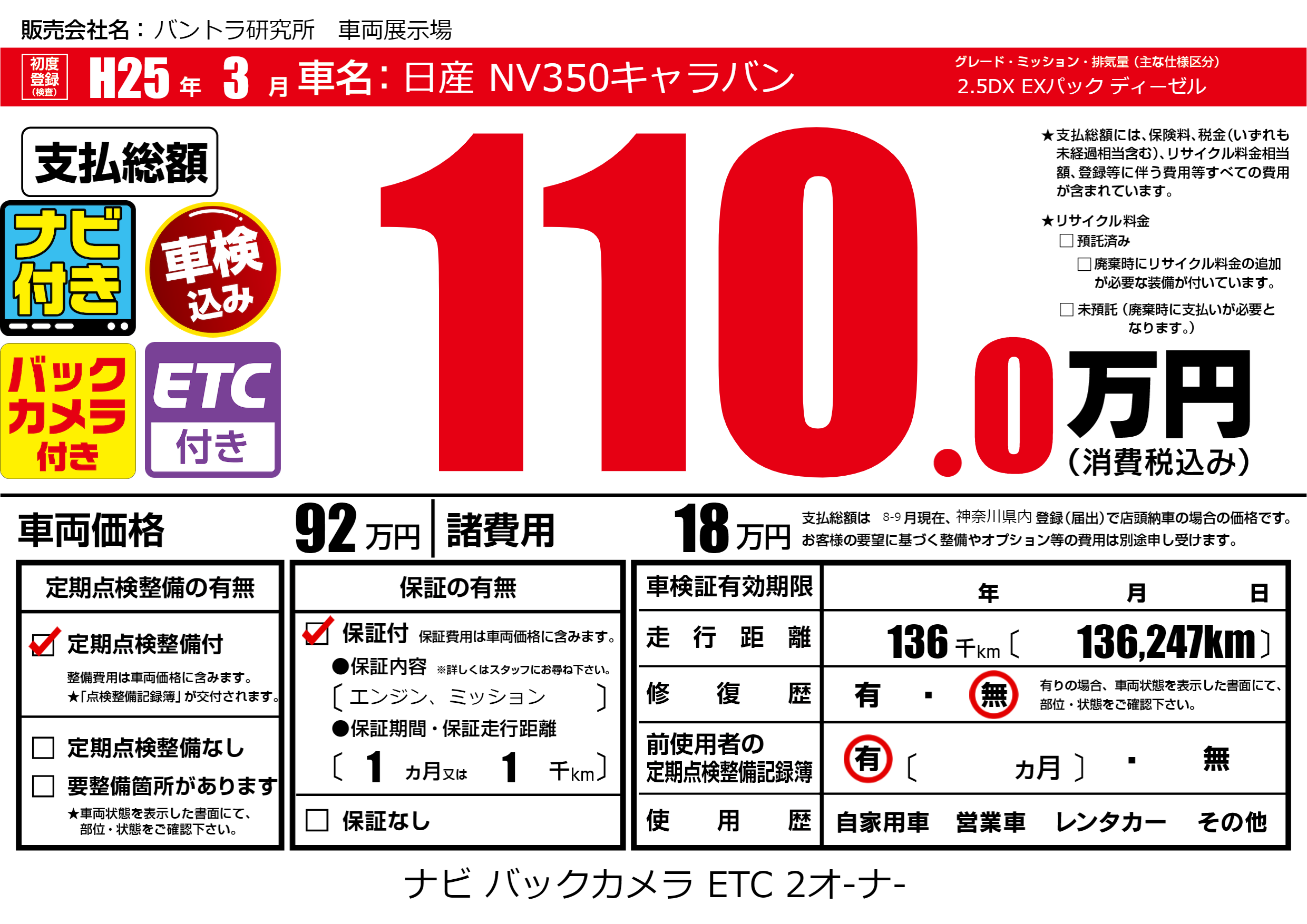 | 車名 | 日産 NV350キャラバン | グレード ミッション 排気量 |