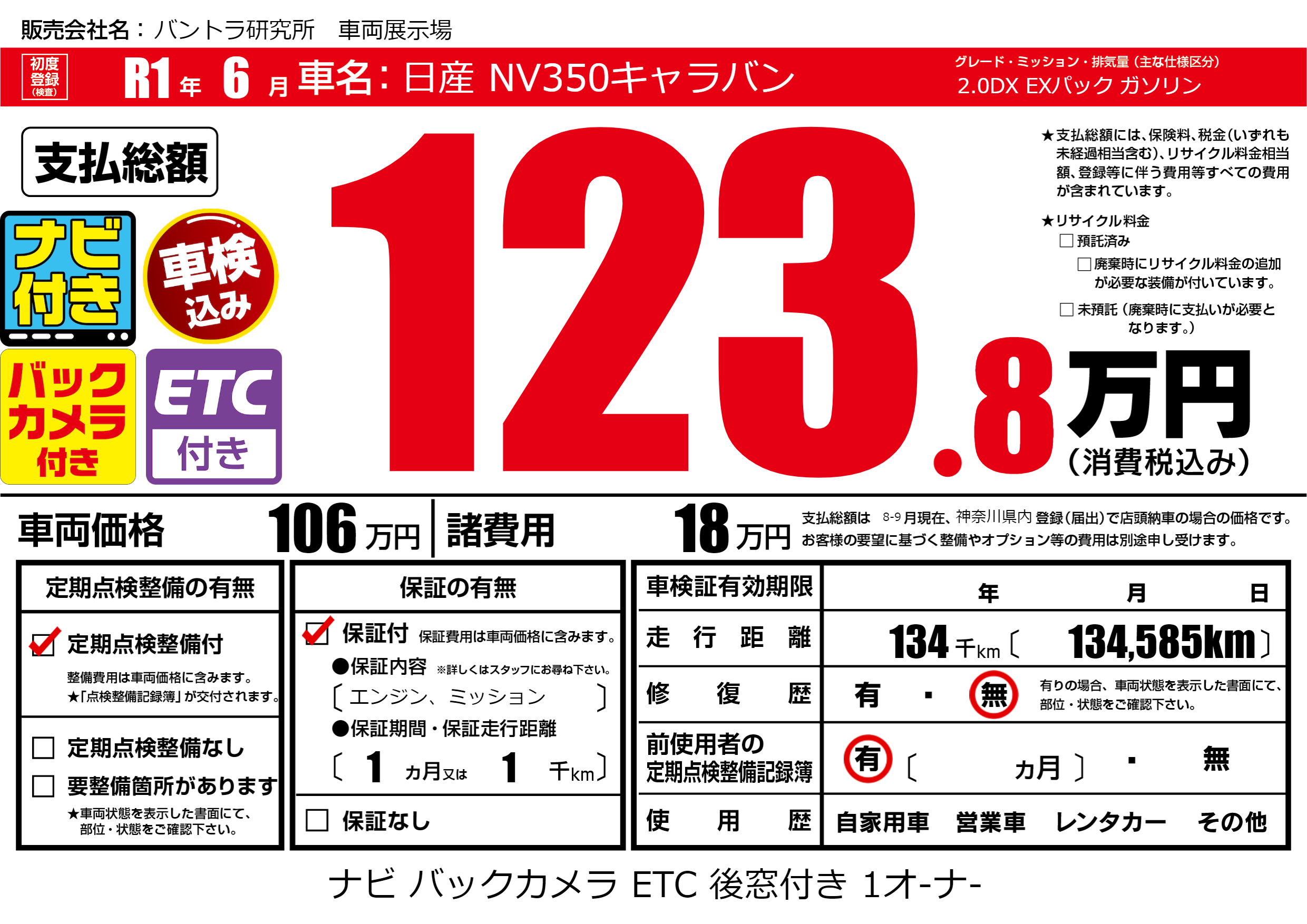 | 車名 | 日産 NV350キャラバン | グレード ミッション 排気量 |