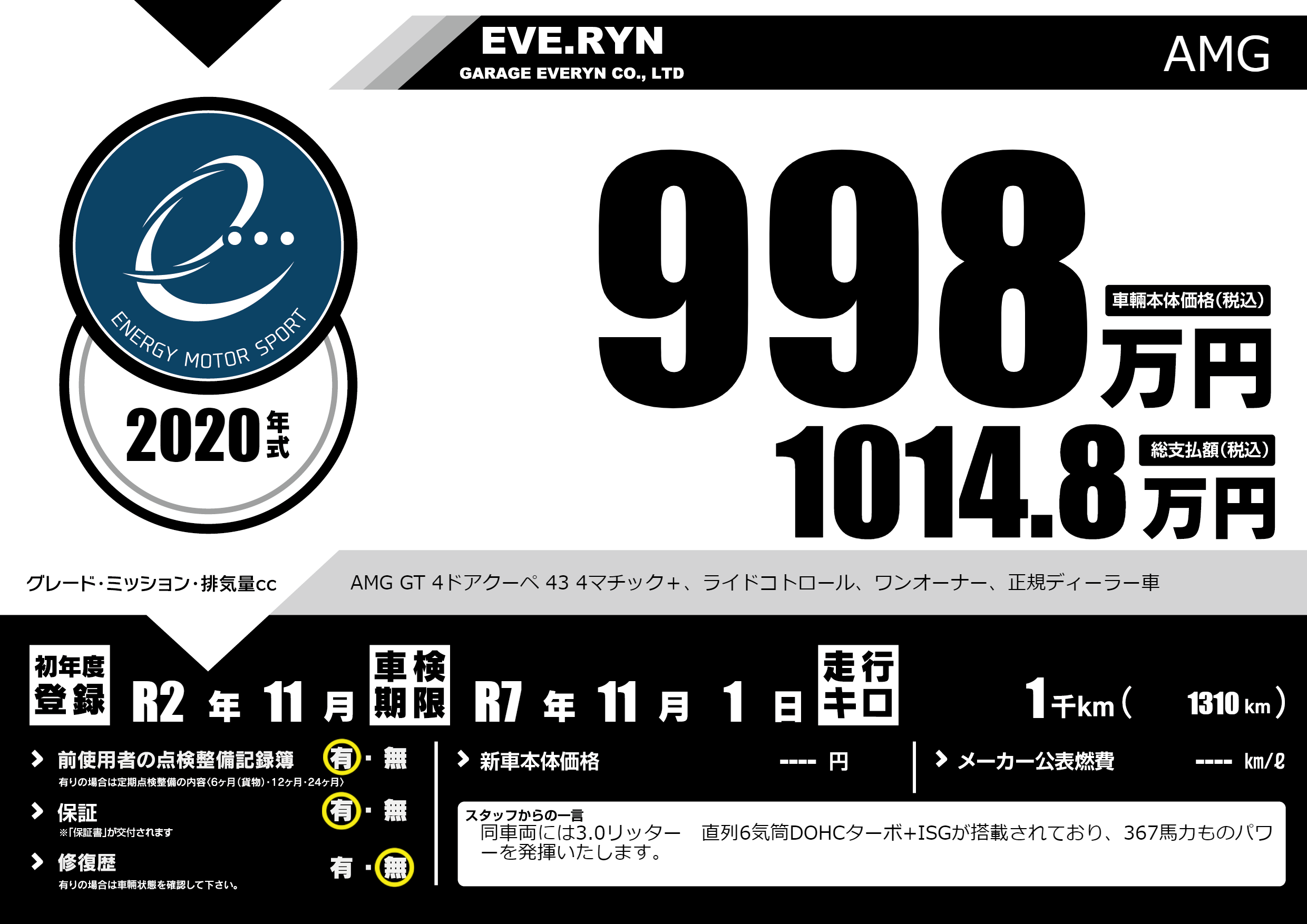 AMG GT 4ドアクーペ 43 4マチック+、ライドコトロール、ワンオーナー、正規ディーラー車 |
