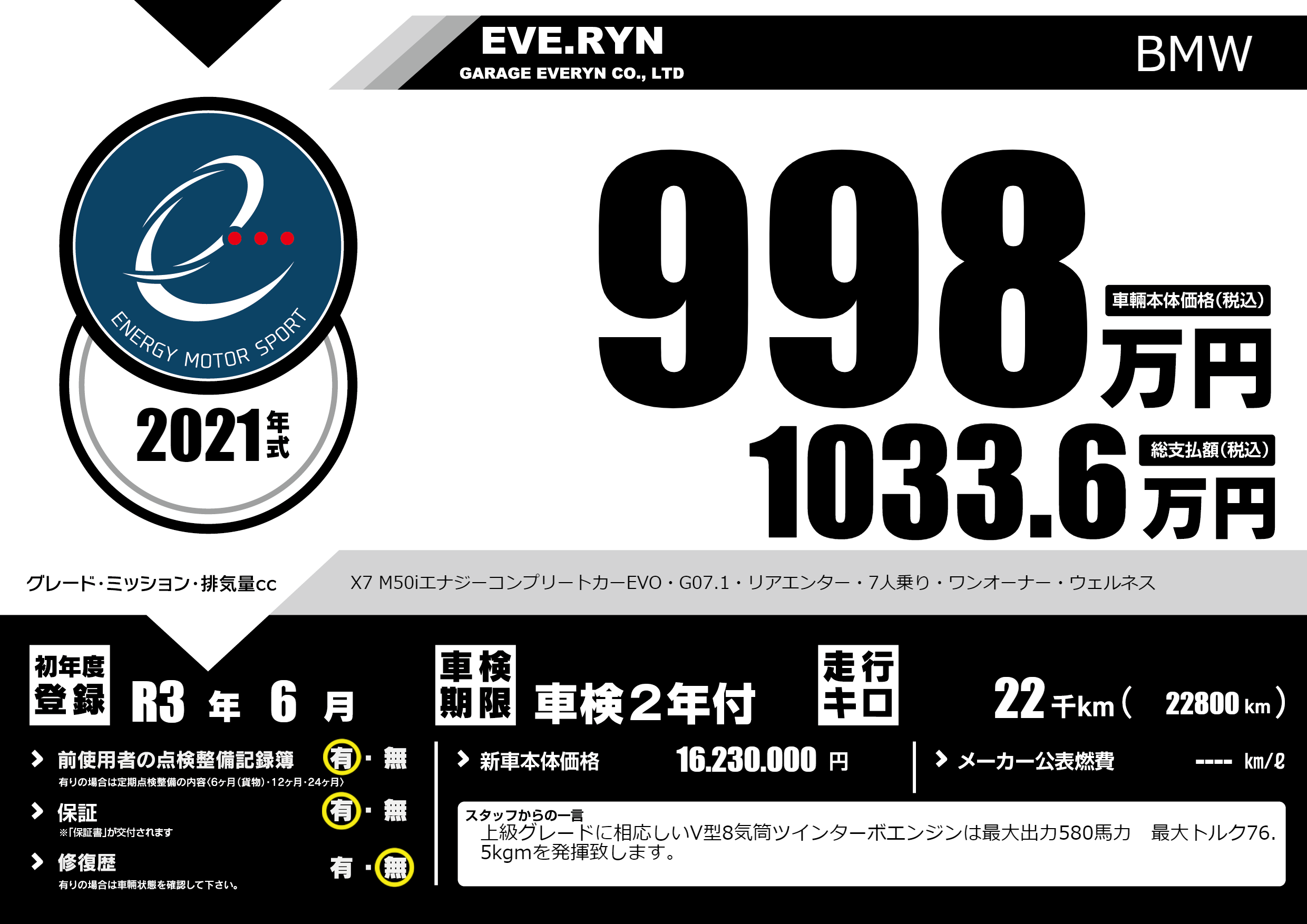 X7 M50iエナジーコンプリートカーEVO・G07.1・リアエンター・7人乗り・ワンオーナー・ウェルネス |