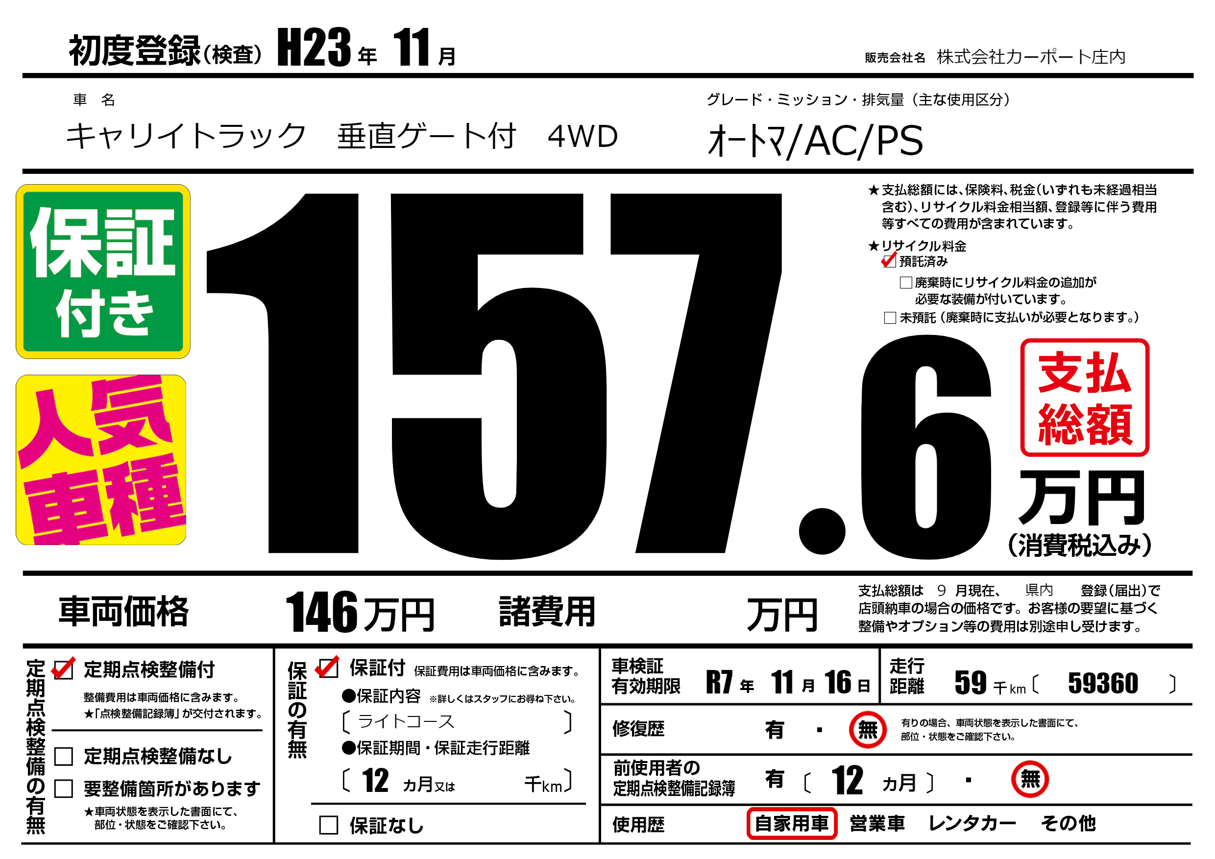 なし | 車検制限 | R7年11月16月 |