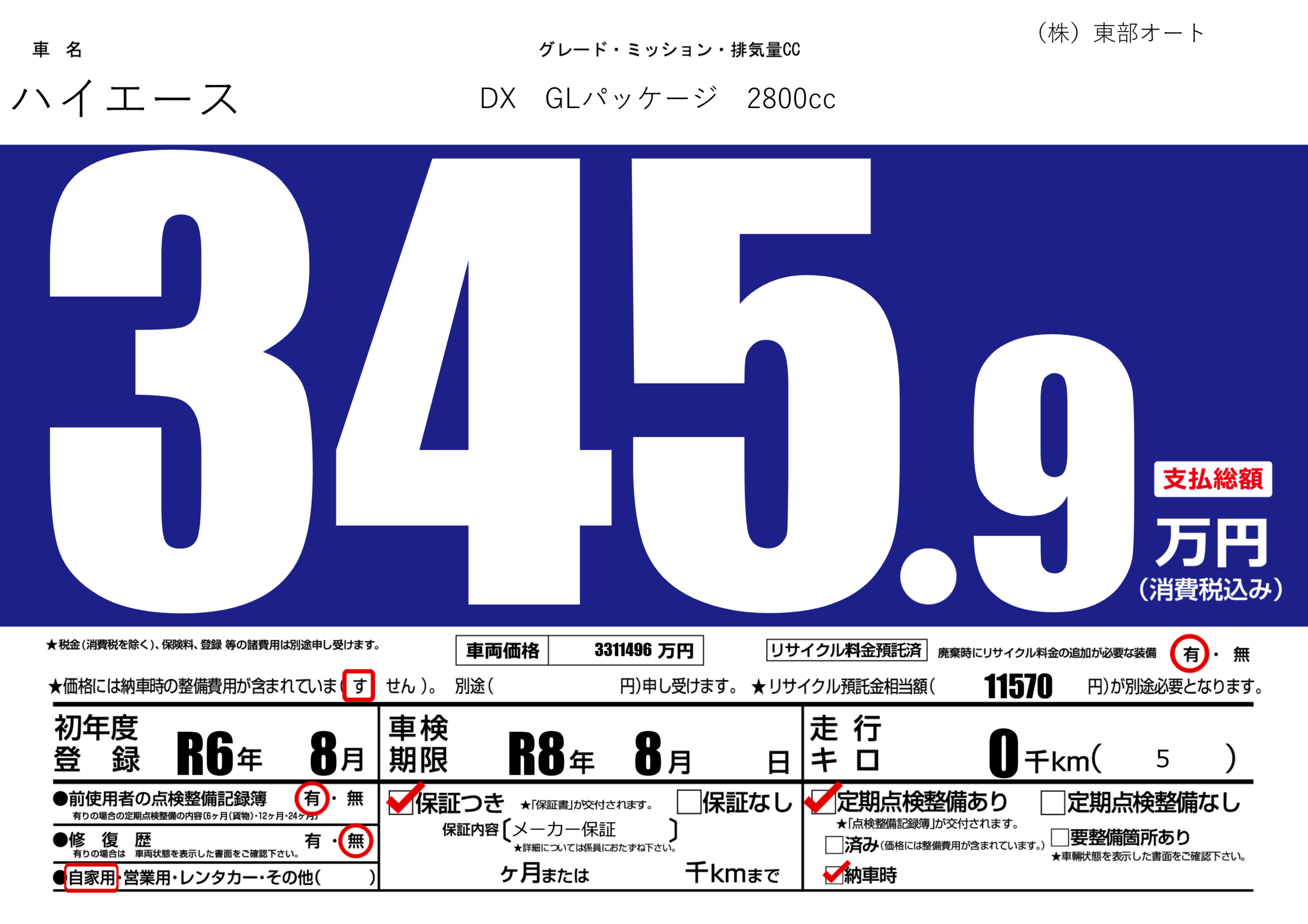 | 車検制限 | R8年 8月 - 日 | ||