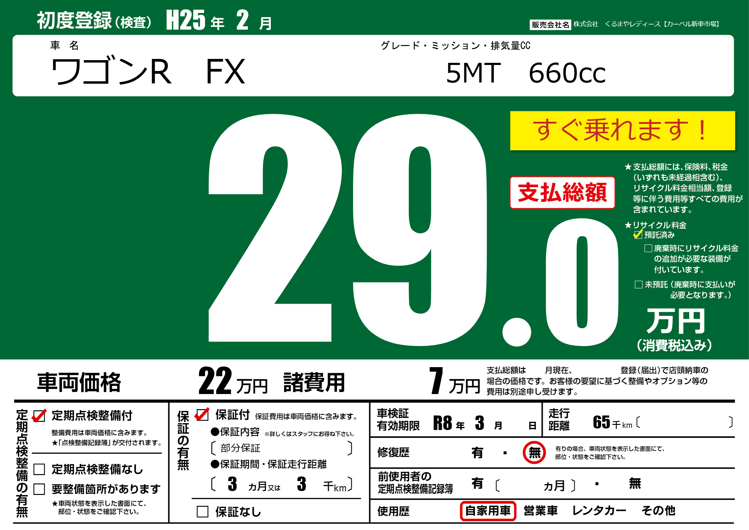 | 車名 | ワゴンR FX | グレード ミッション 排気量 |