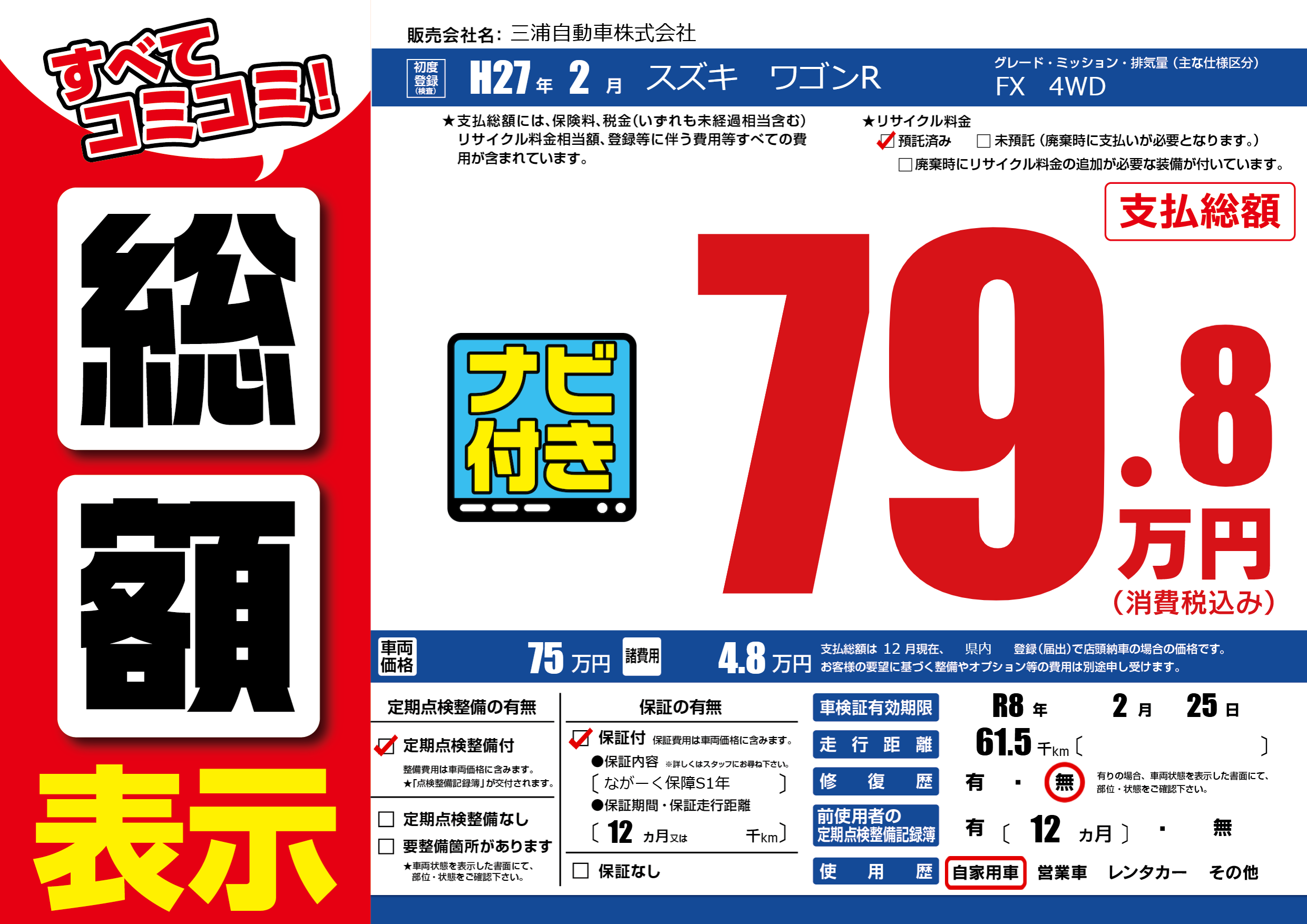 | 車名 | スズキ ワゴンR | グレード ミッション 排気量 |