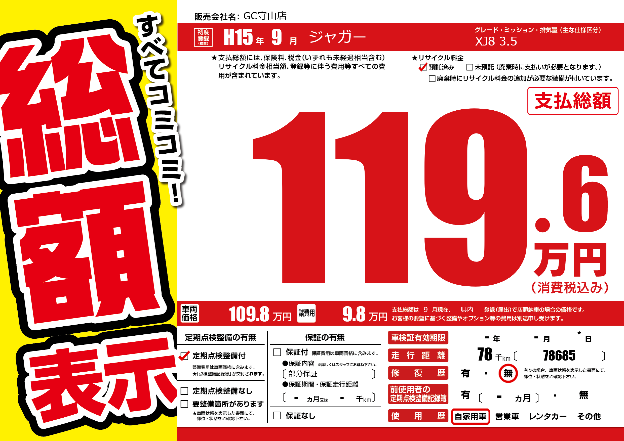 | 走行キロ | 7.8万km | 初年度登録 | H15年9月 |