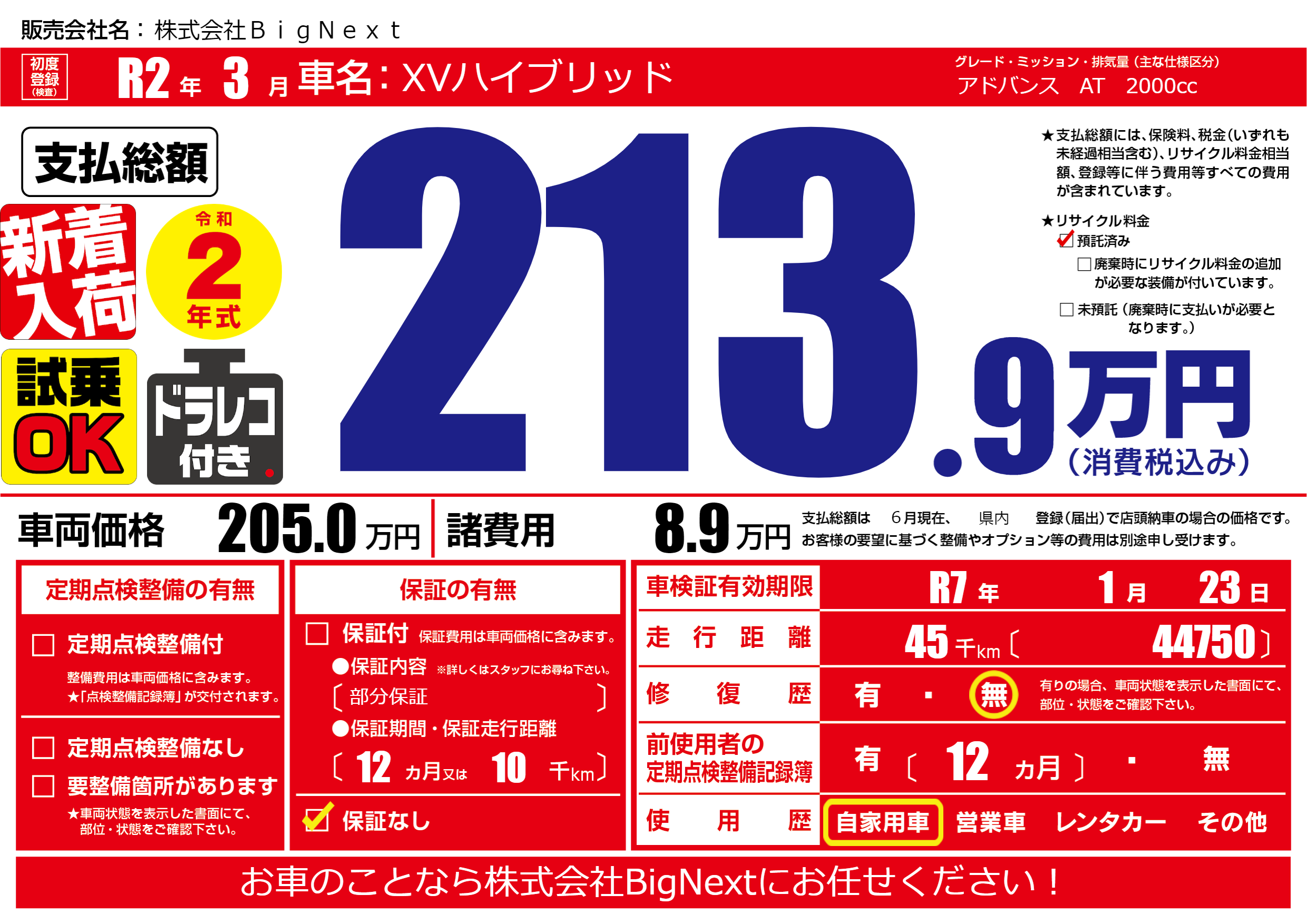 | 車名 | XVハイブリッド | グレード ミッション 排気量 |