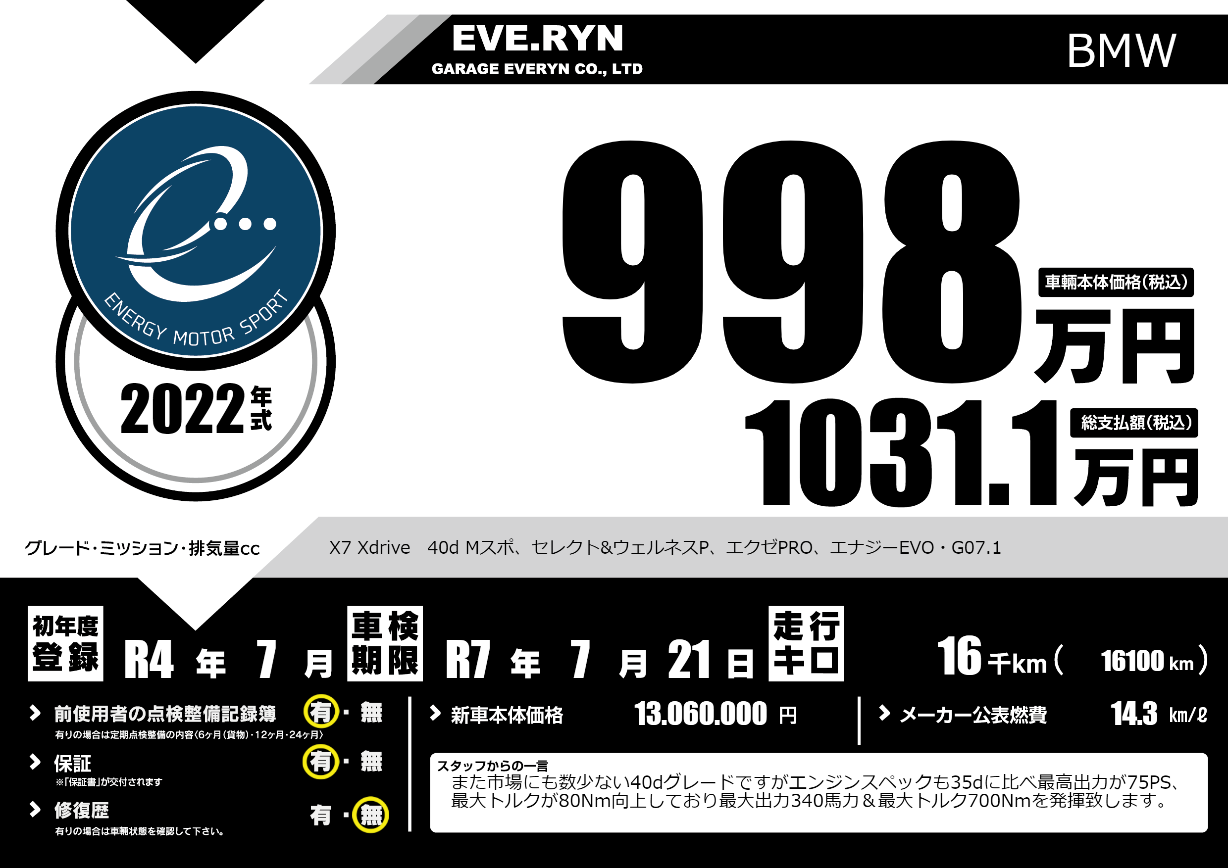 X7 Xdrive 40d Mスポ、セレクト&ウェルネスP、エクゼPRO、エナジーEVO・G07.1 |