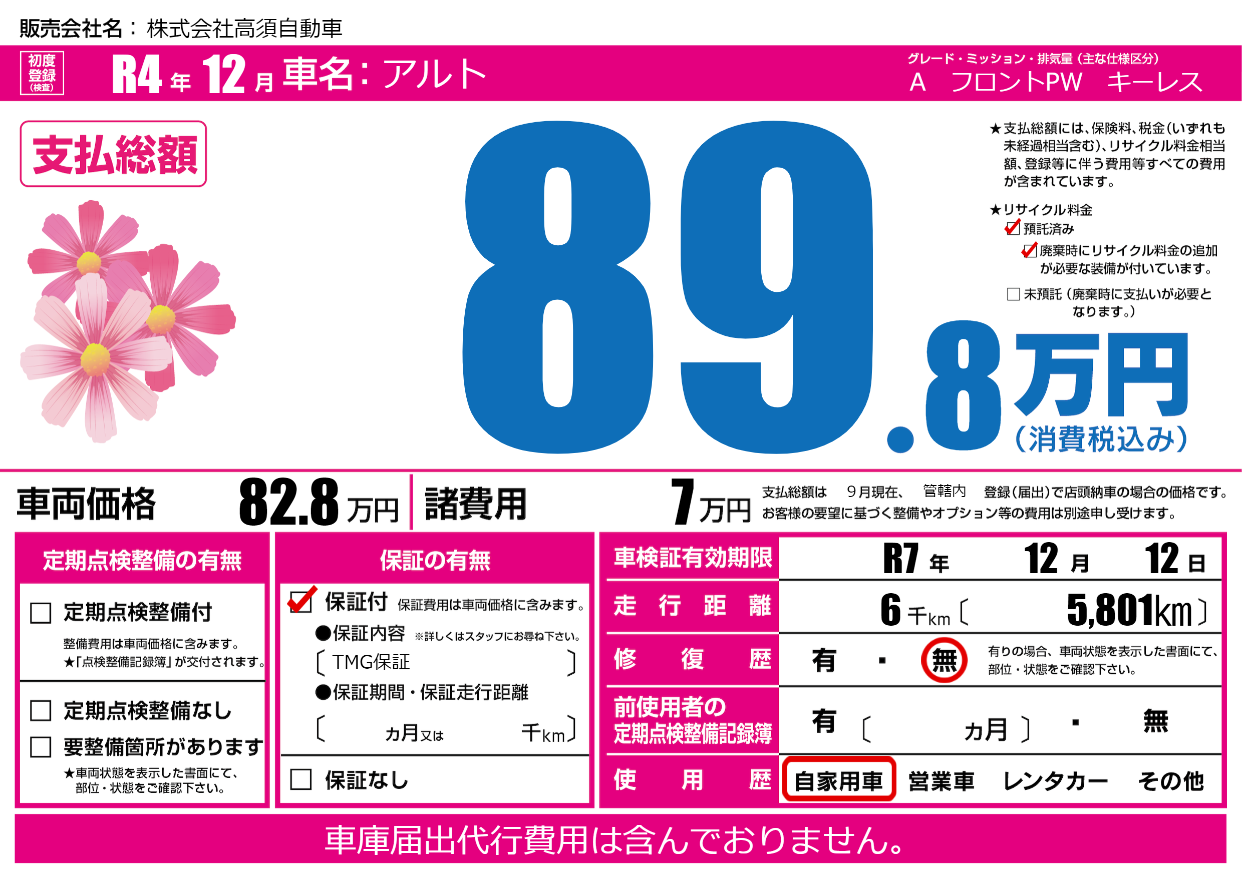 なし | 車検制限 | R7年12月12月 |