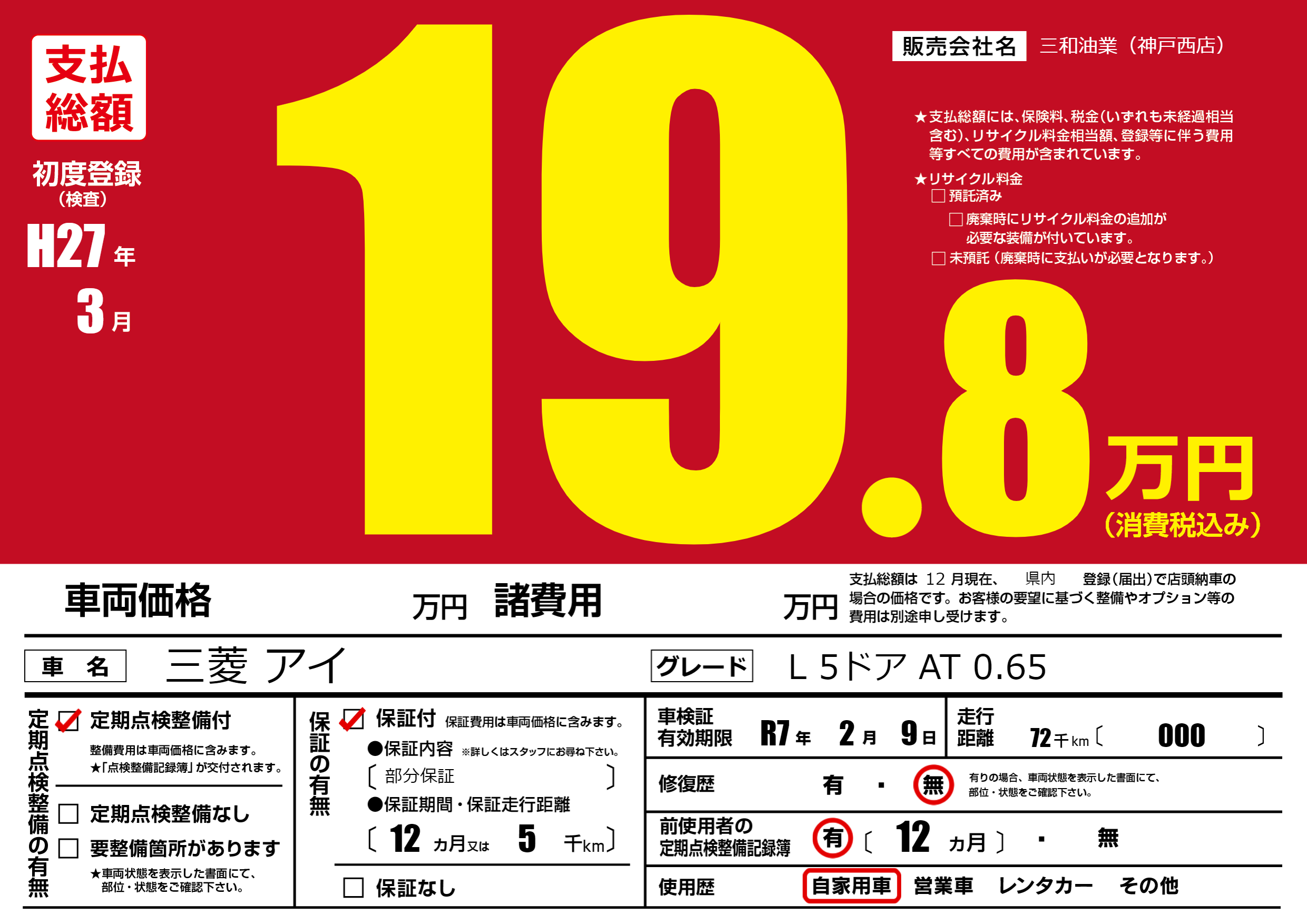 保証付き 保証内容(部分保証) 12ヶ月または(5)千kmまで |