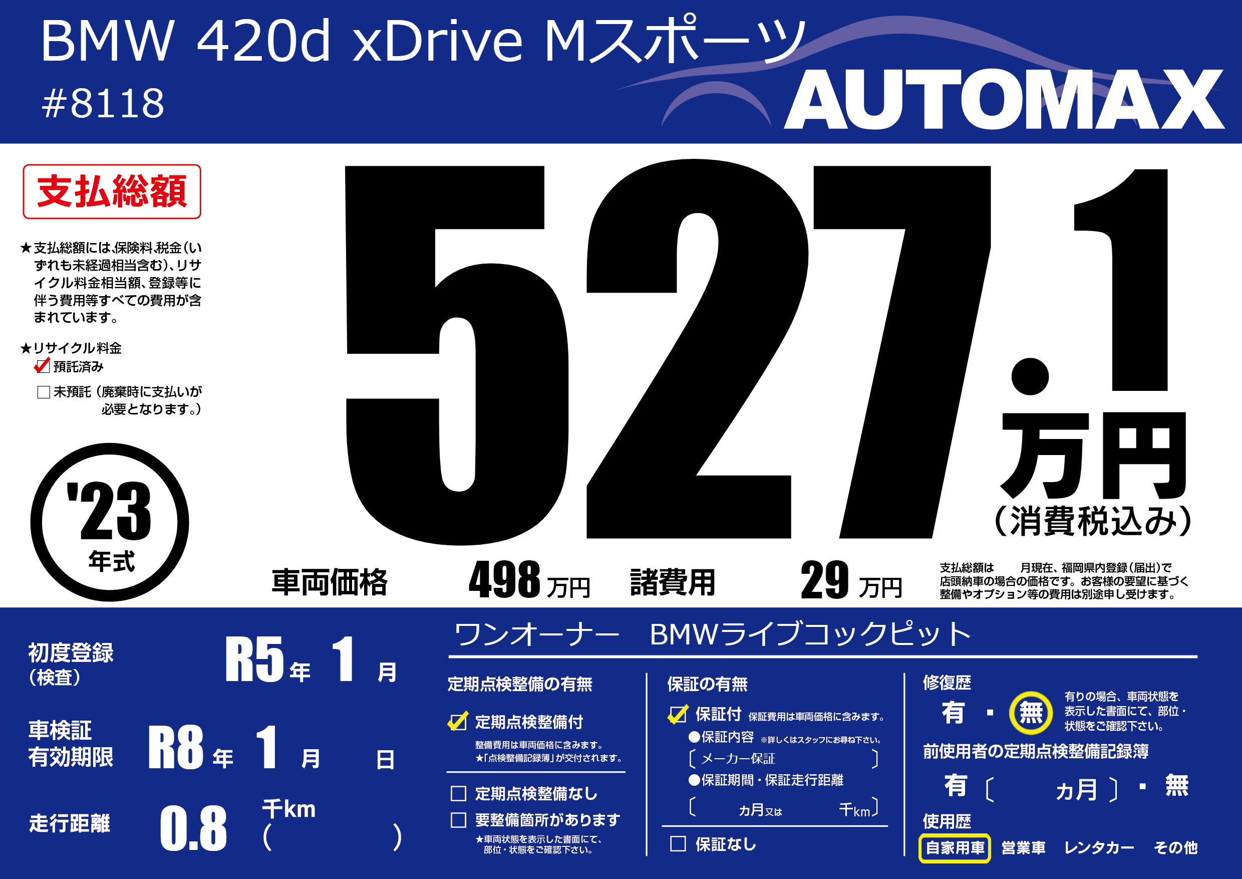 | 車名 | BMW 420d xDrive Mスポーツ | グレード ミッション 排気量 |