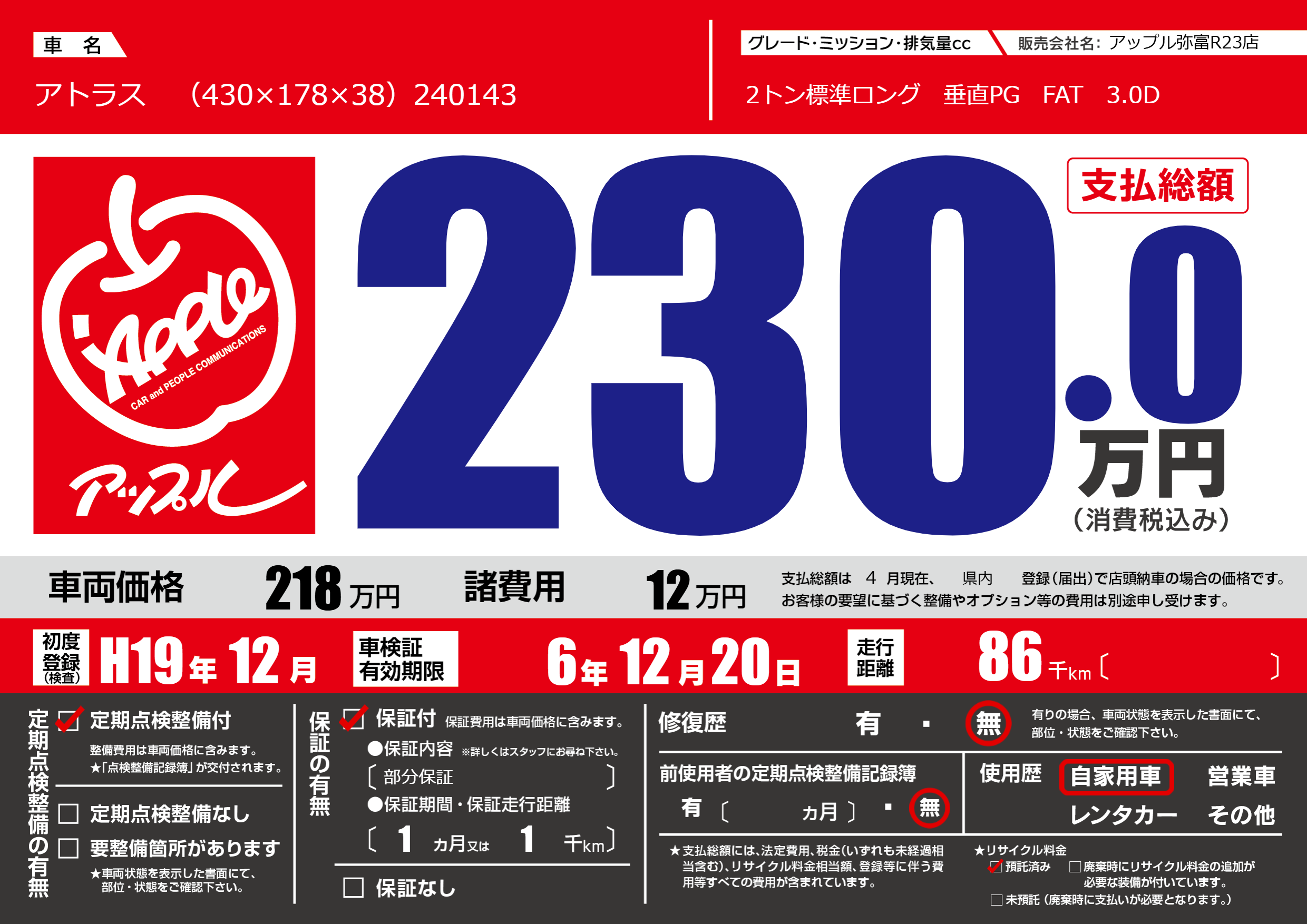 | 車名 | アトラス (430×178×38)240143 | グレード ミッション 排気量 |