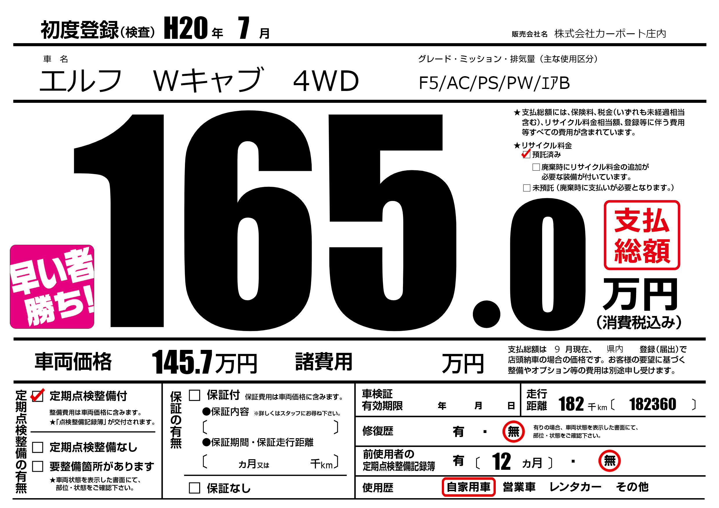 | 走行キロ | 18.2万km | 初年度登録 | H20年7月 |