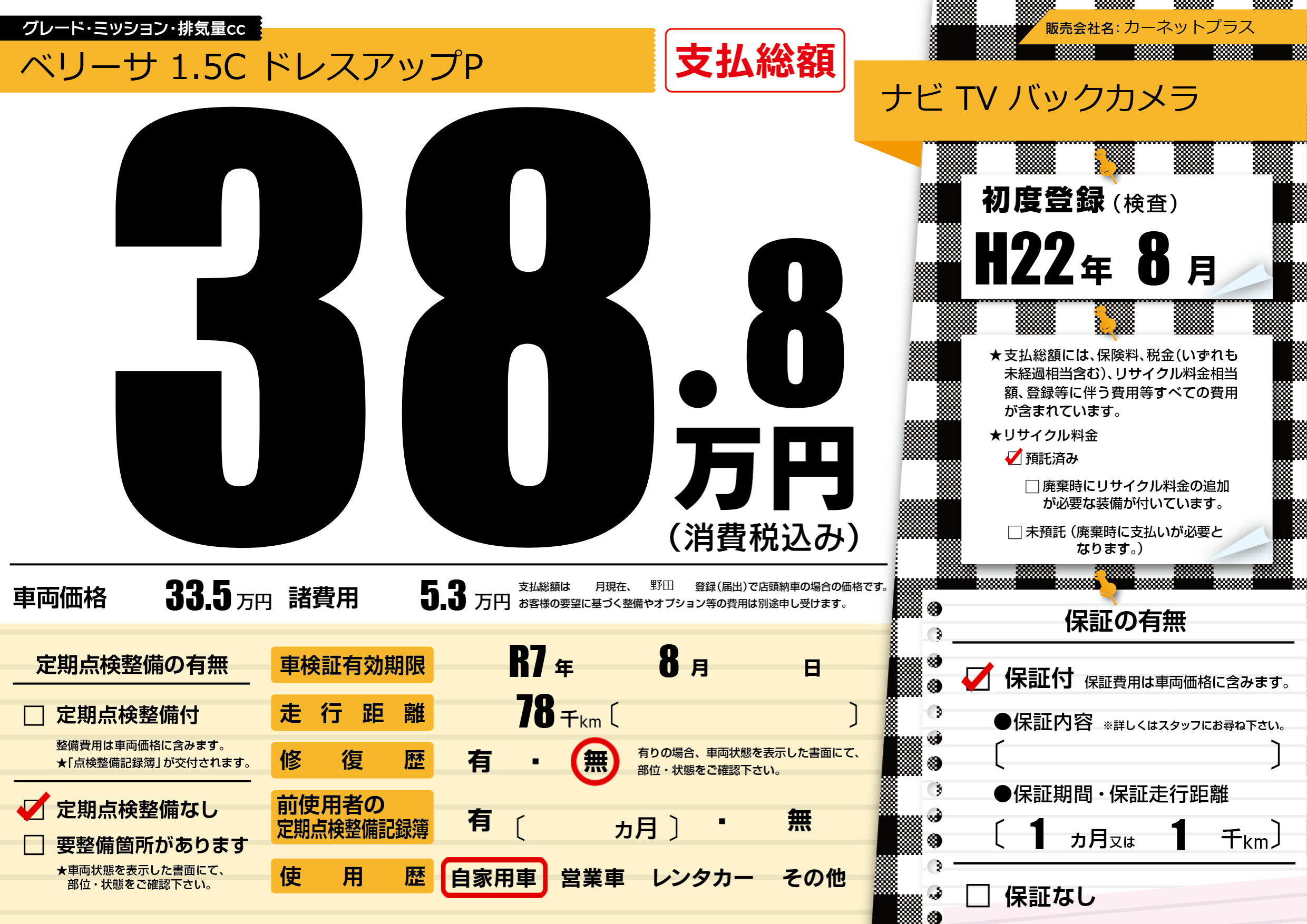 | 走行キロ | 7.8万km | 初年度登録 | H22年8月 |