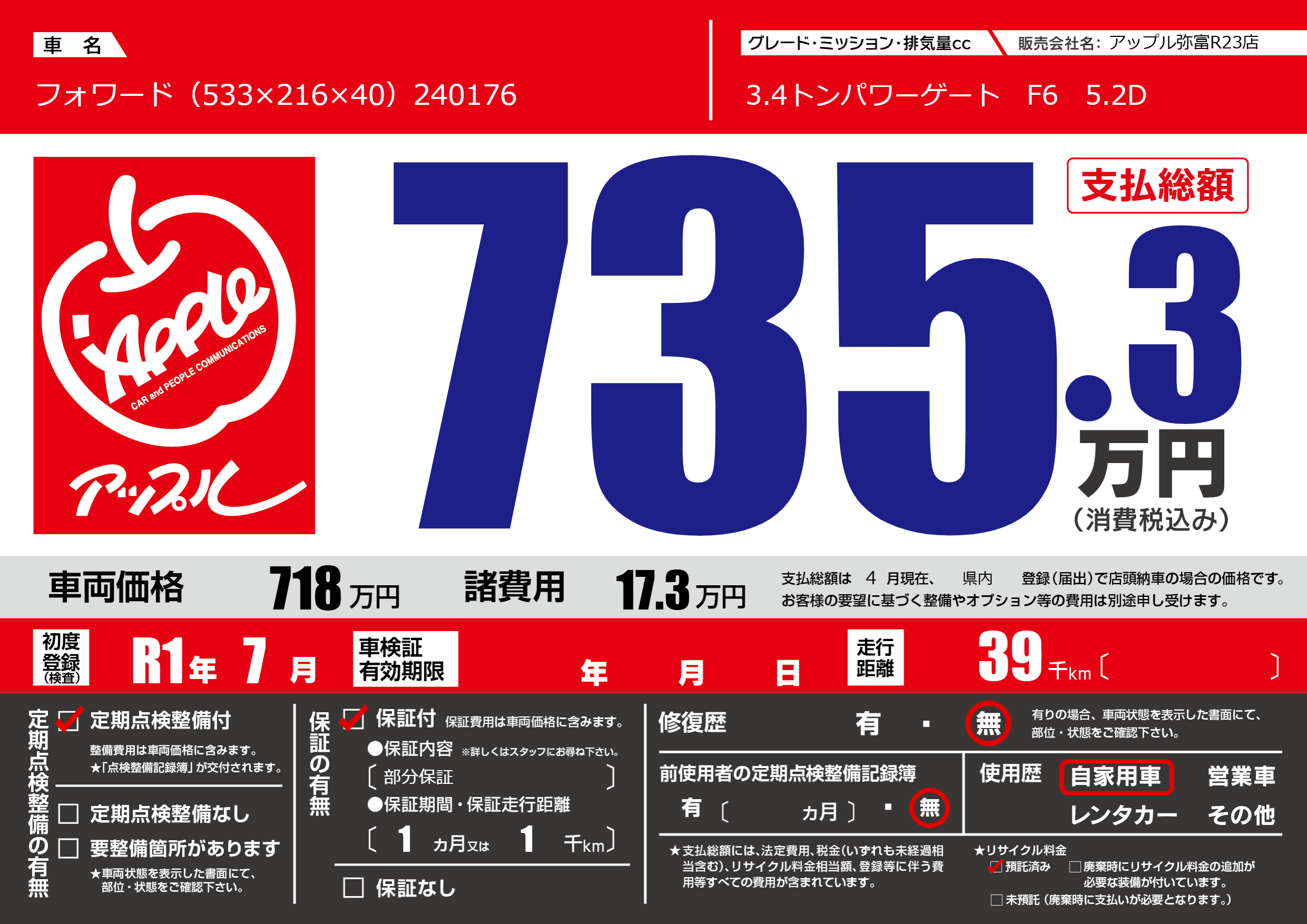 | 車名 | フォワード(533×216×40)240176 | グレード ミッション 排気量 |