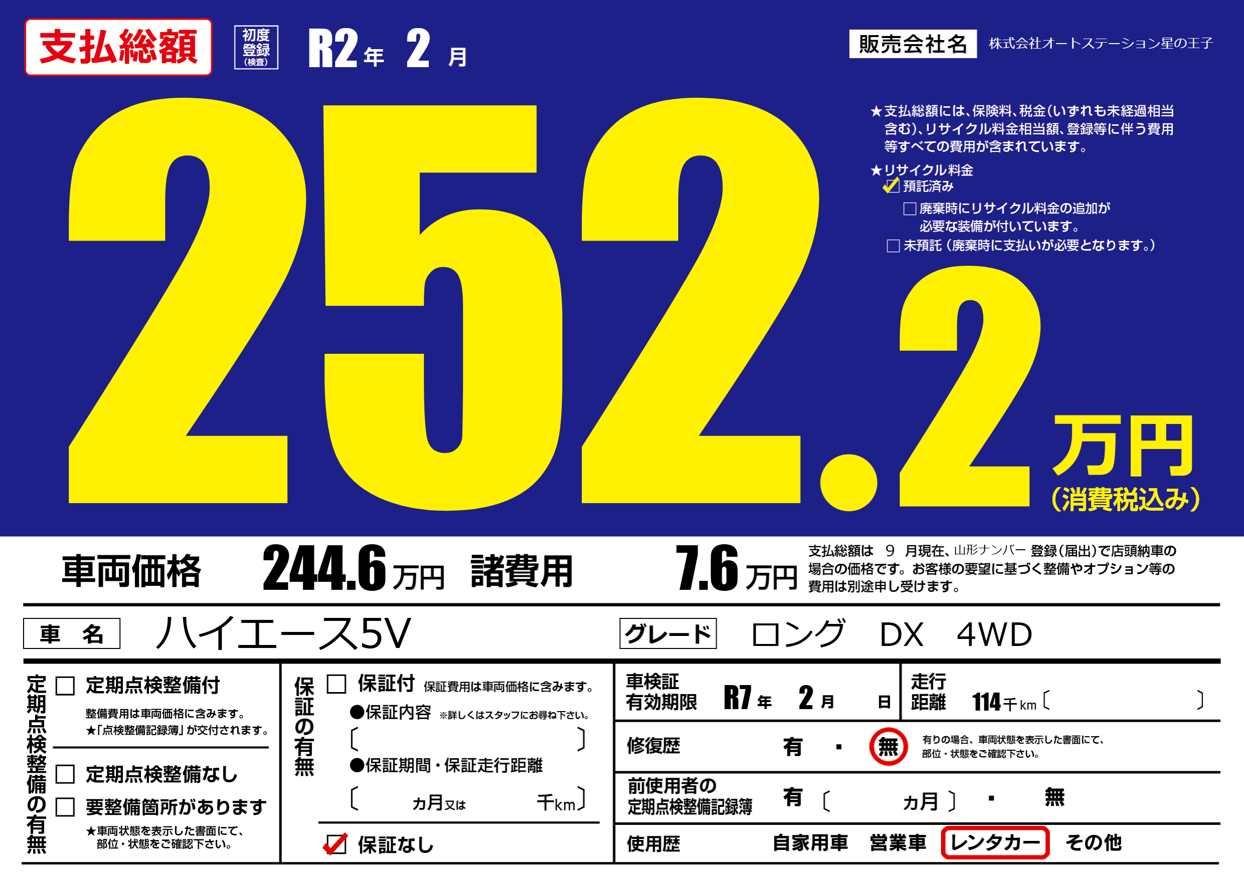 | 車名 | ハイエース5V | グレード ミッション 排気量 |