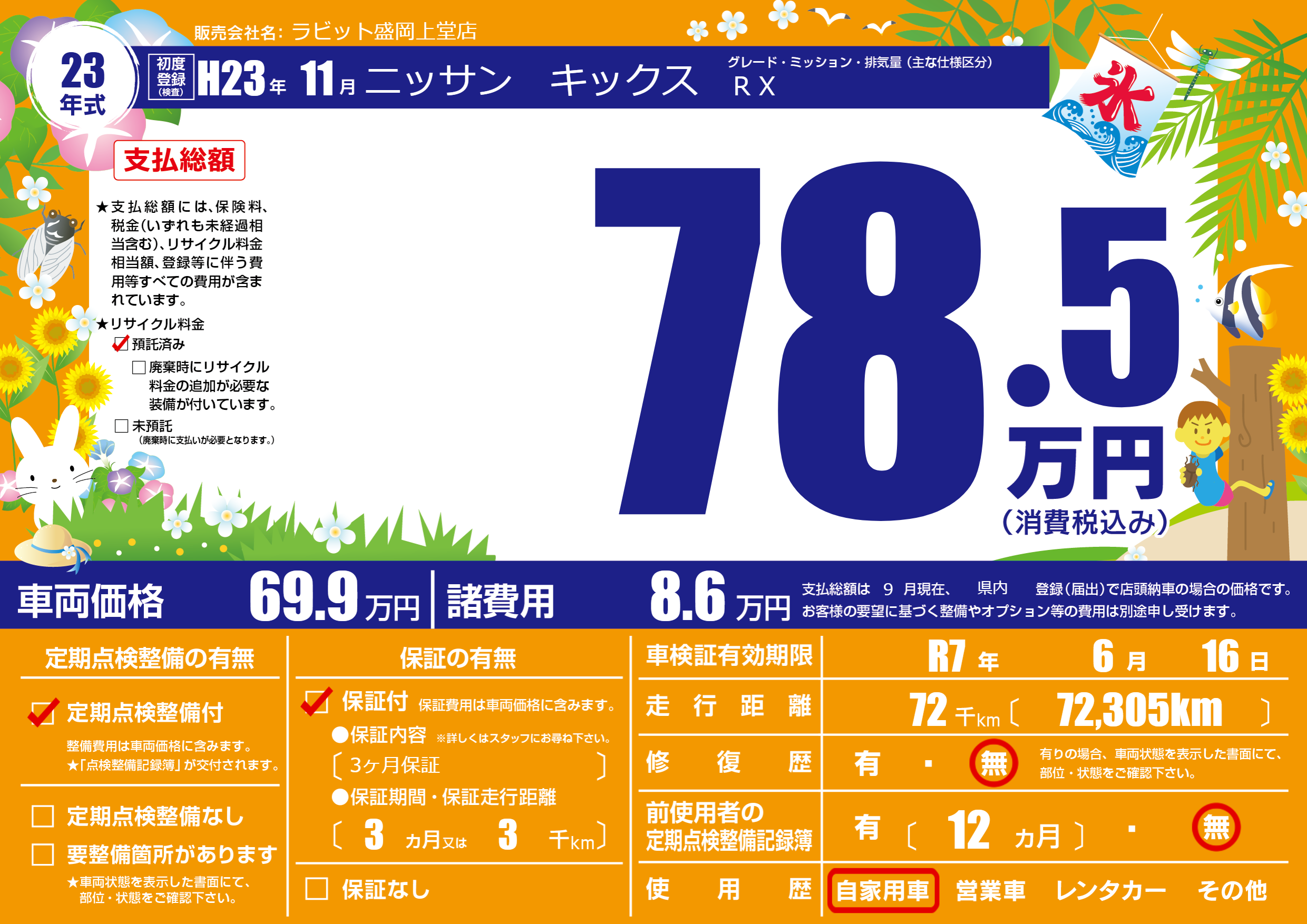| 走行キロ | 7.2万km | 初年度登録 | H23年11月 |