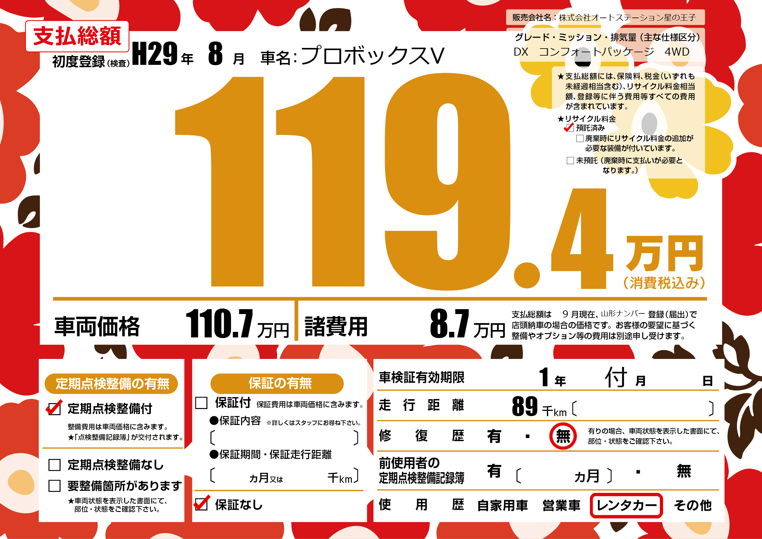 | 走行キロ | 8.9万km | 初年度登録 | H29年8月 |