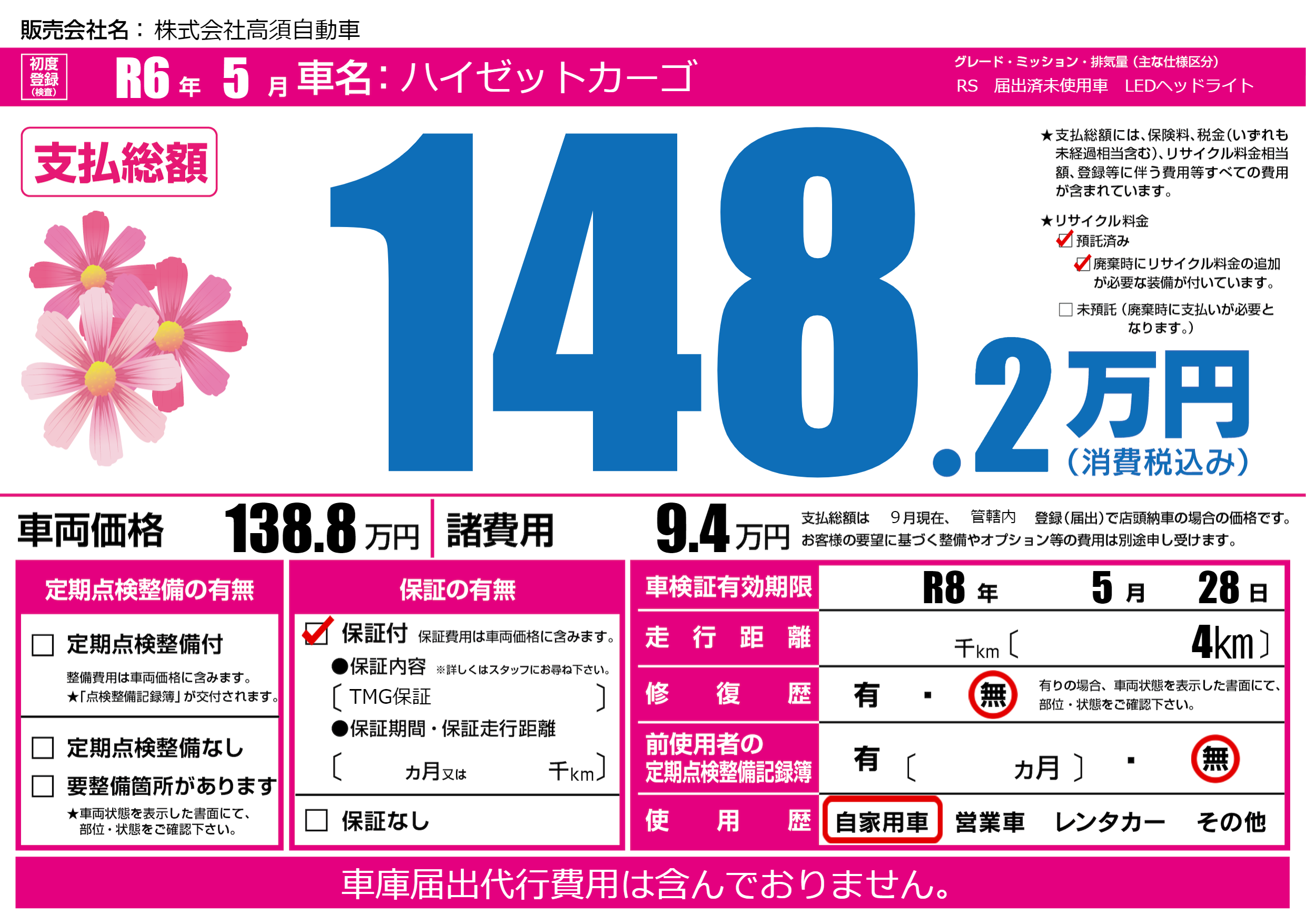 | 車名 | ハイゼットカーゴ | グレード ミッション 排気量 |