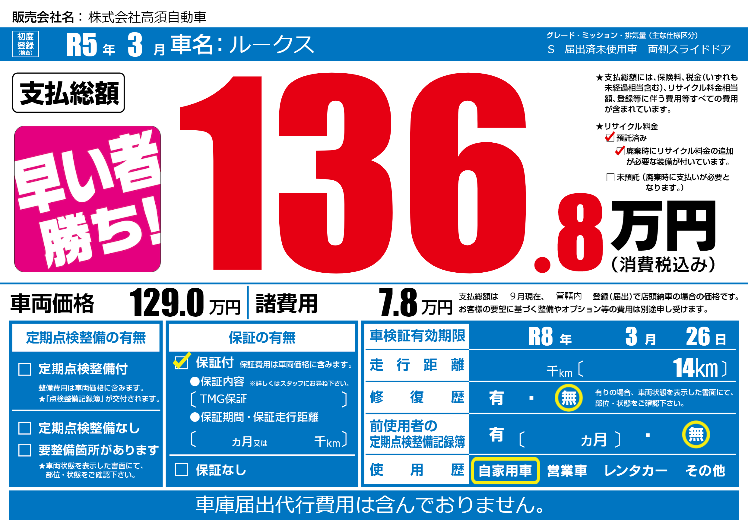 | 走行キロ | - | 初年度登録 | R5年3月 |