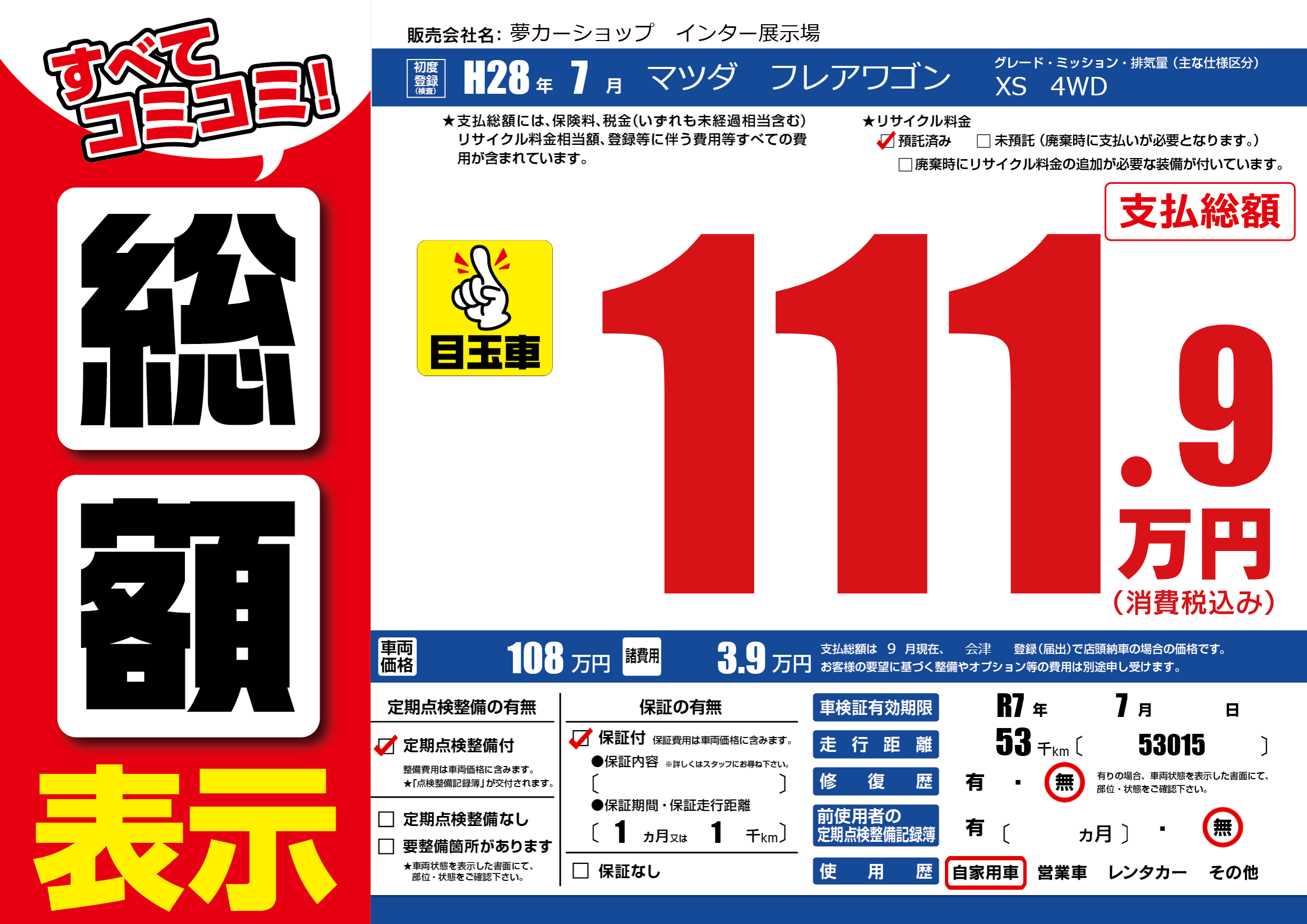 | 車検制限 | R7年 7月 - 日 | ||