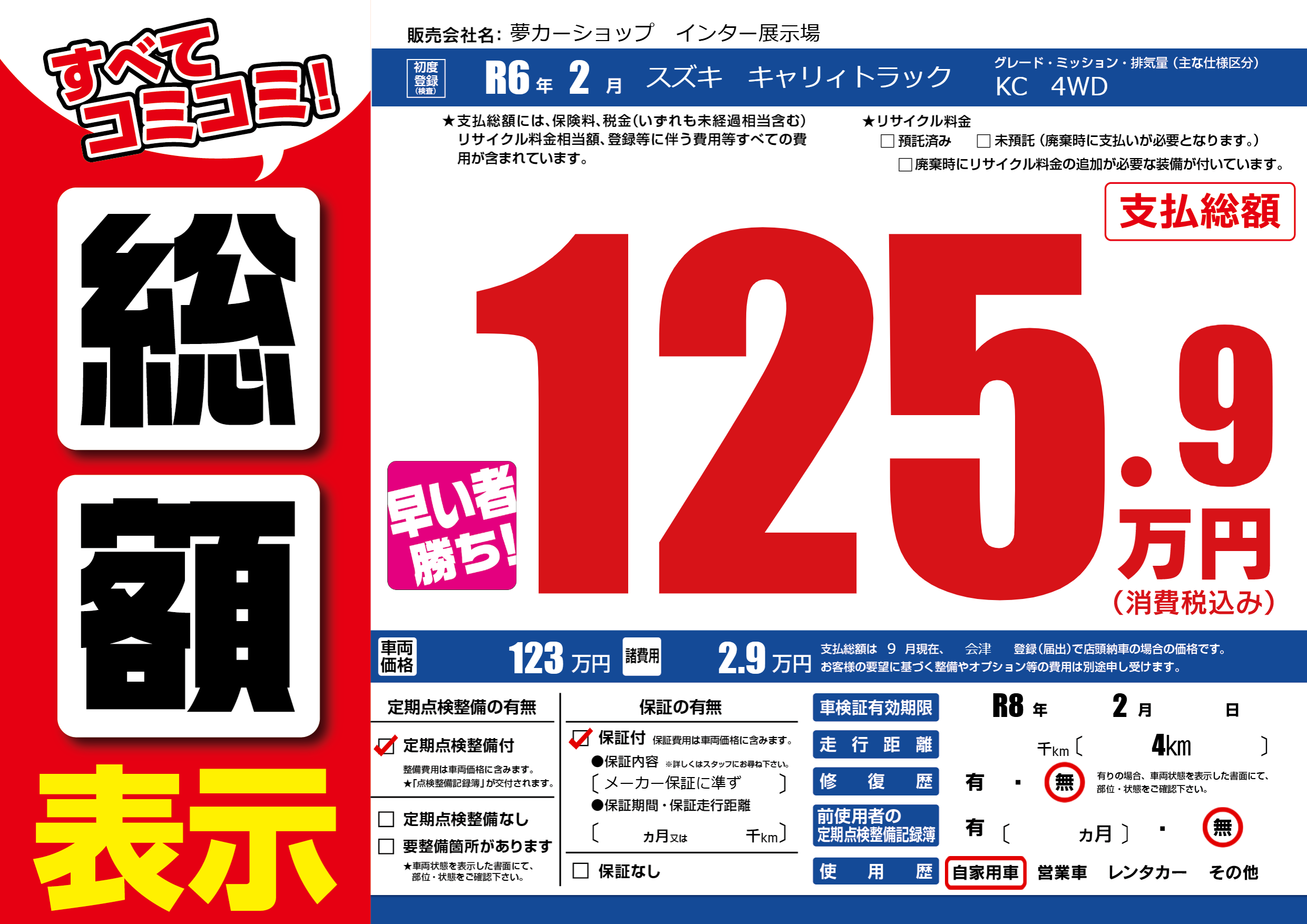 保証付き 保証内容(メーカー保証に準ず) ヶ月または千km |