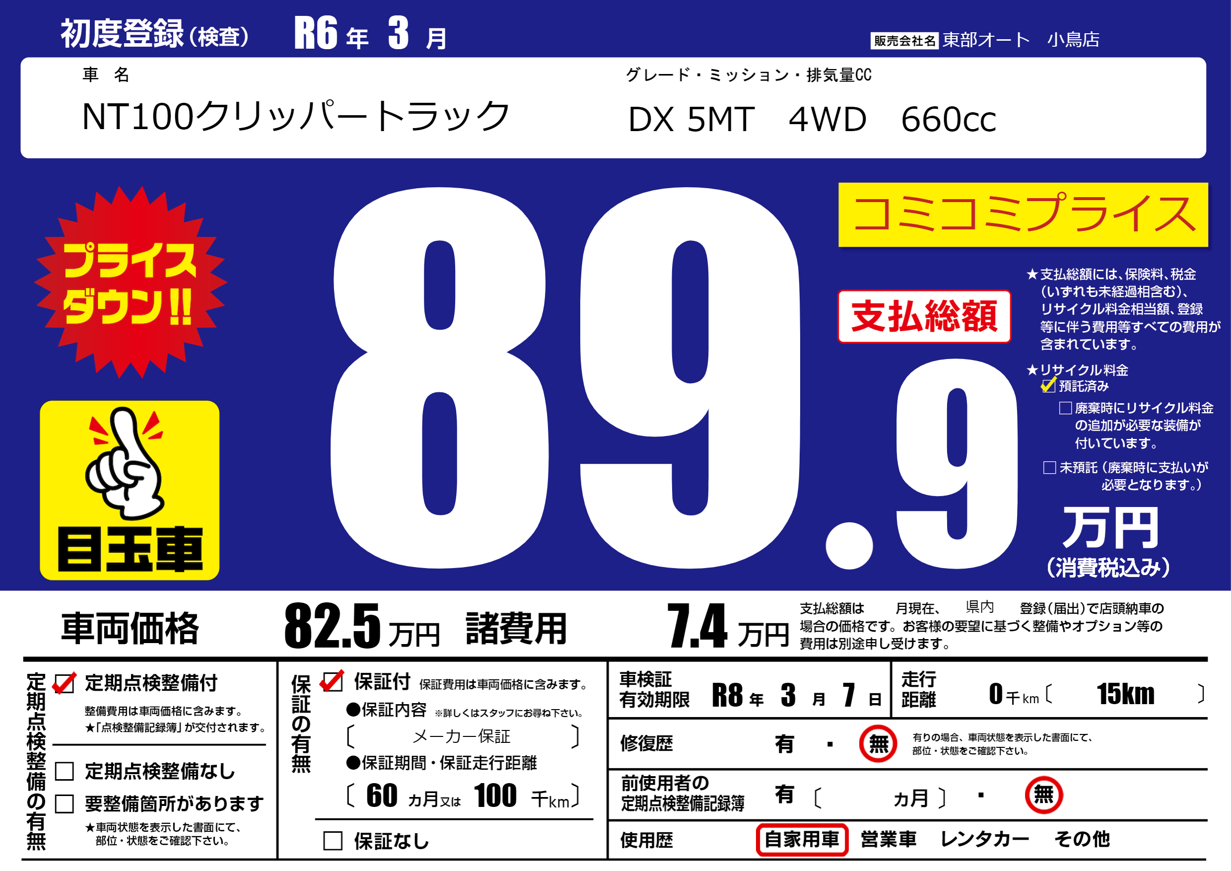| 車名 | NT100クリッパートラック | グレード ミッション 排気量 |