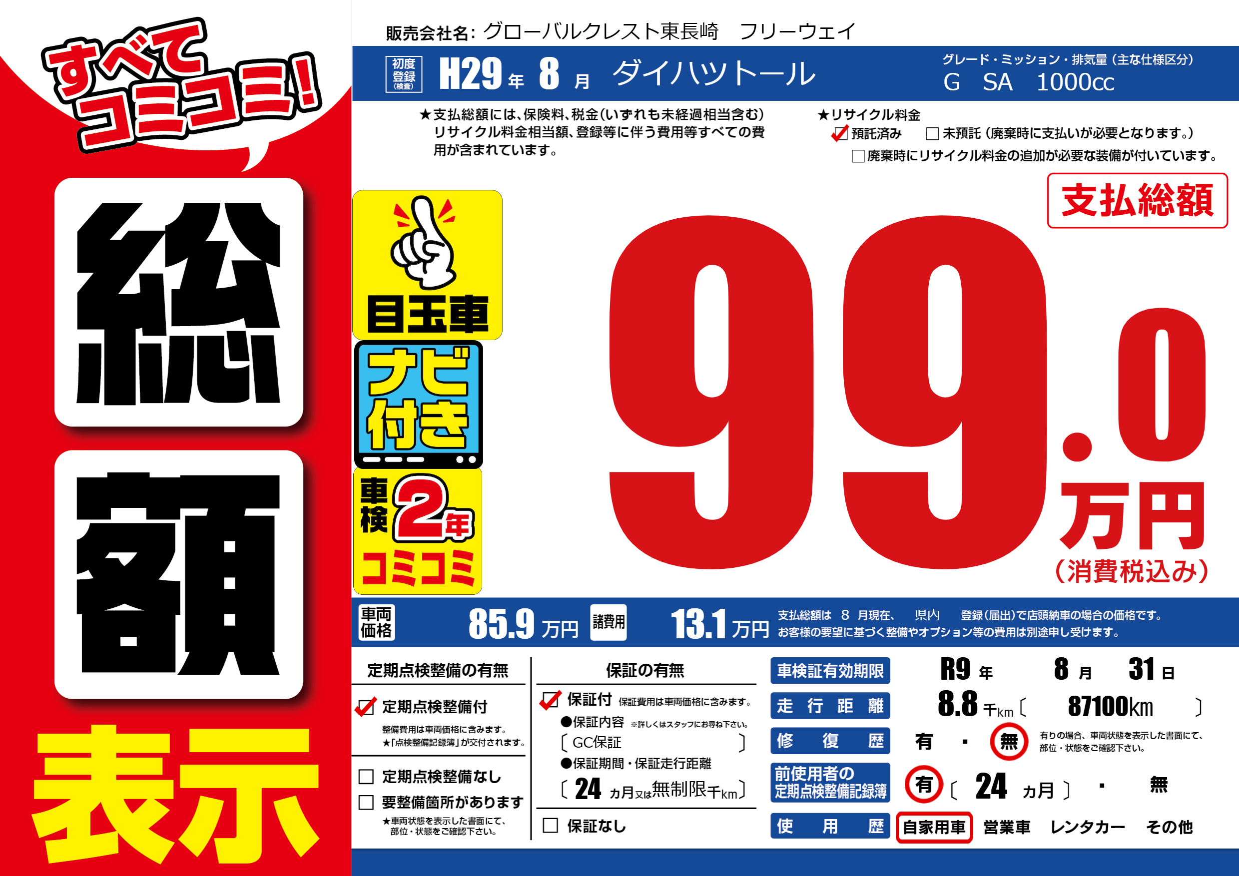 | 走行キロ | 0.8万km | 初年度登録 | H29年8月 |