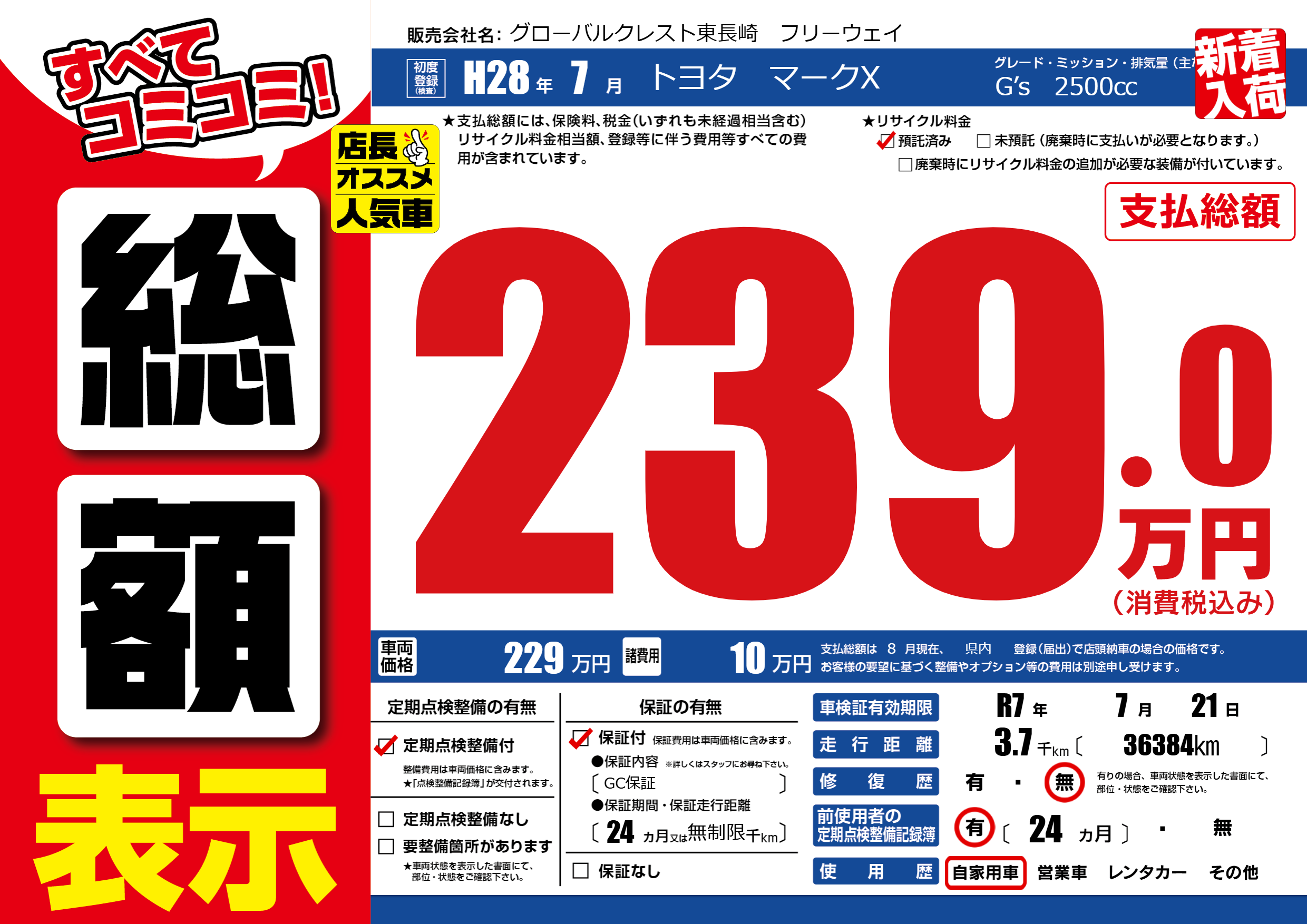 | 走行キロ | 0.3万km | 初年度登録 | H28年7月 |