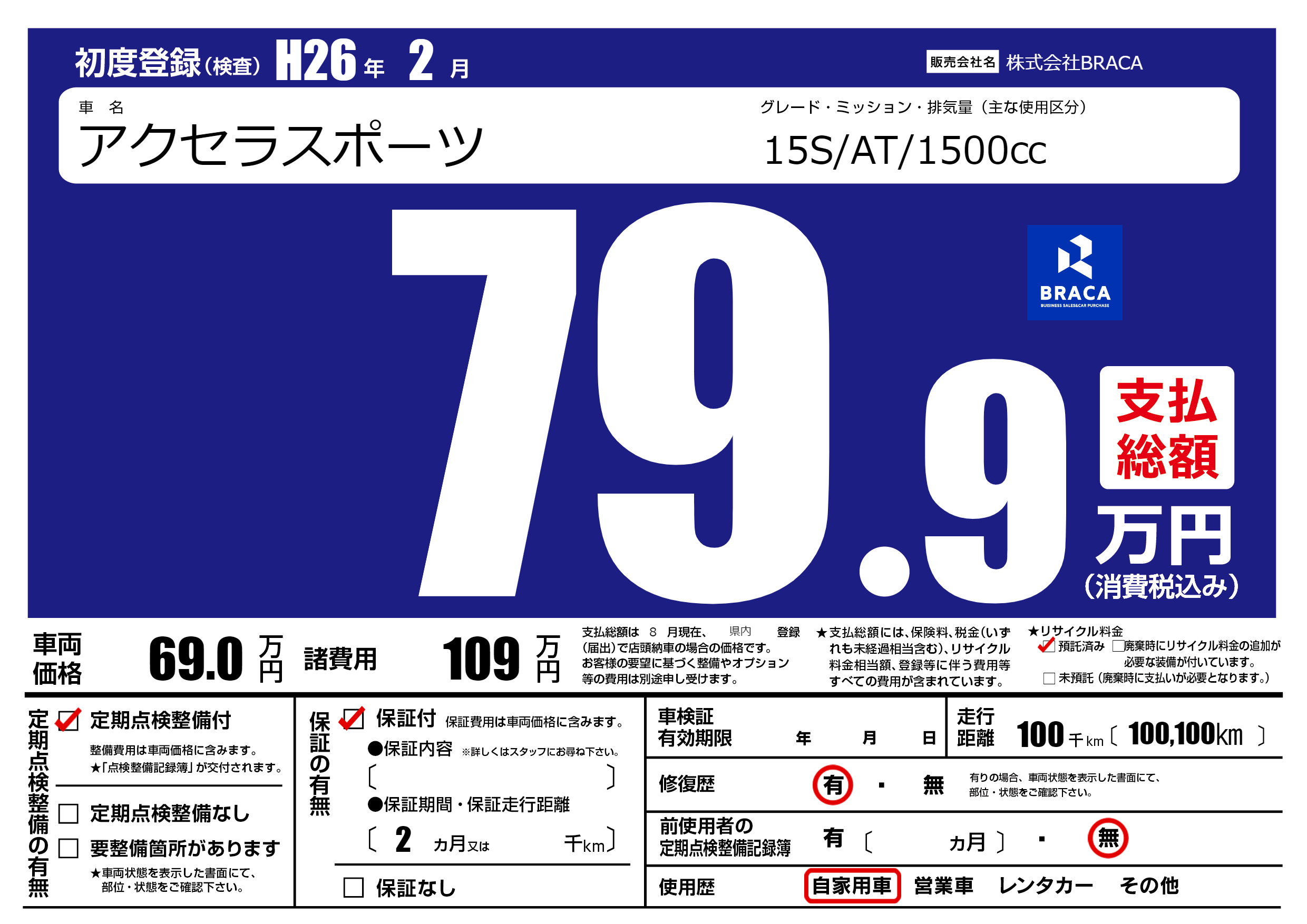 | 走行キロ | 10万km | 初年度登録 | H26年2月 |