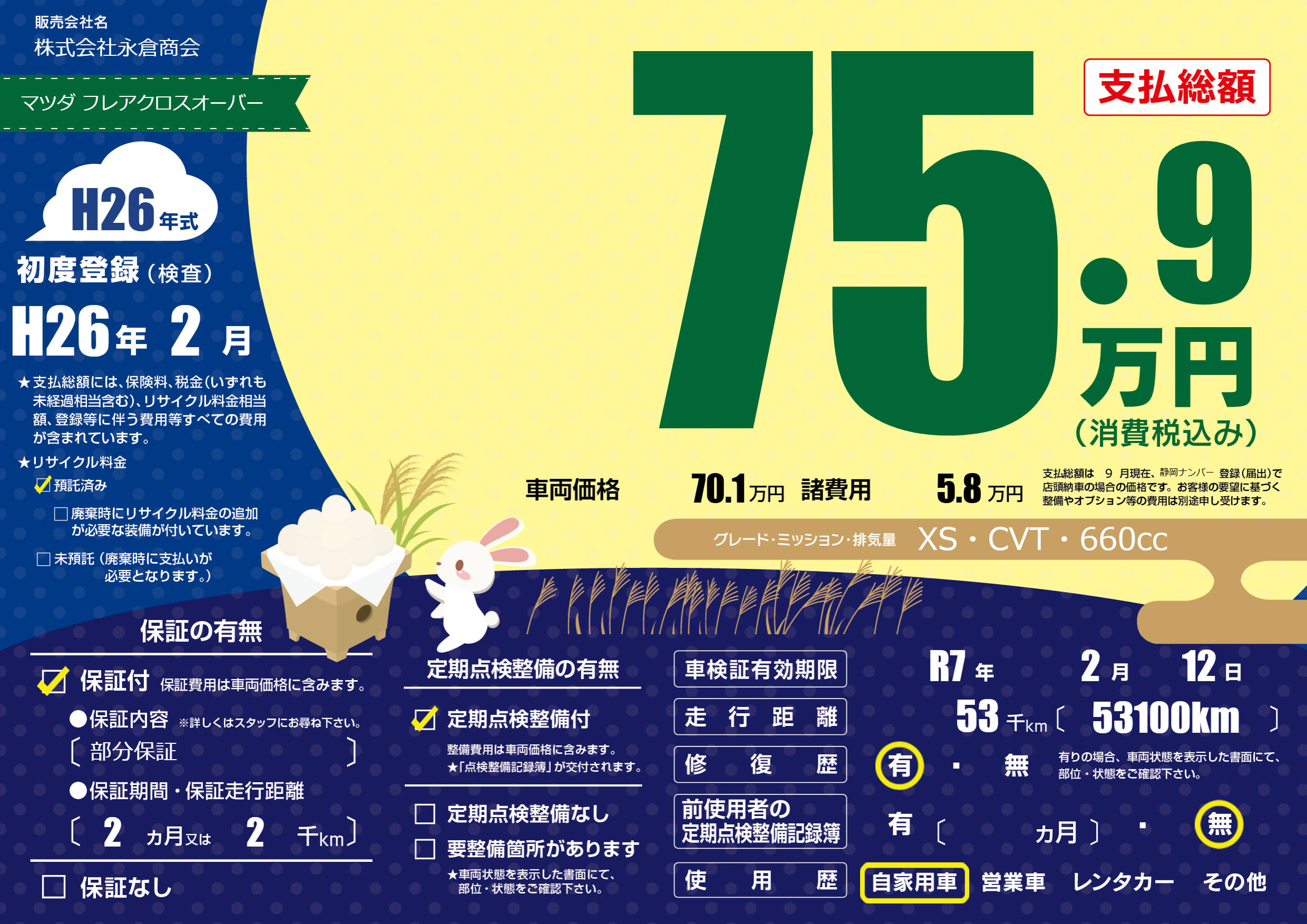 | 車名 | マツダ フレアクロスオーバー | グレード ミッション 排気量 |