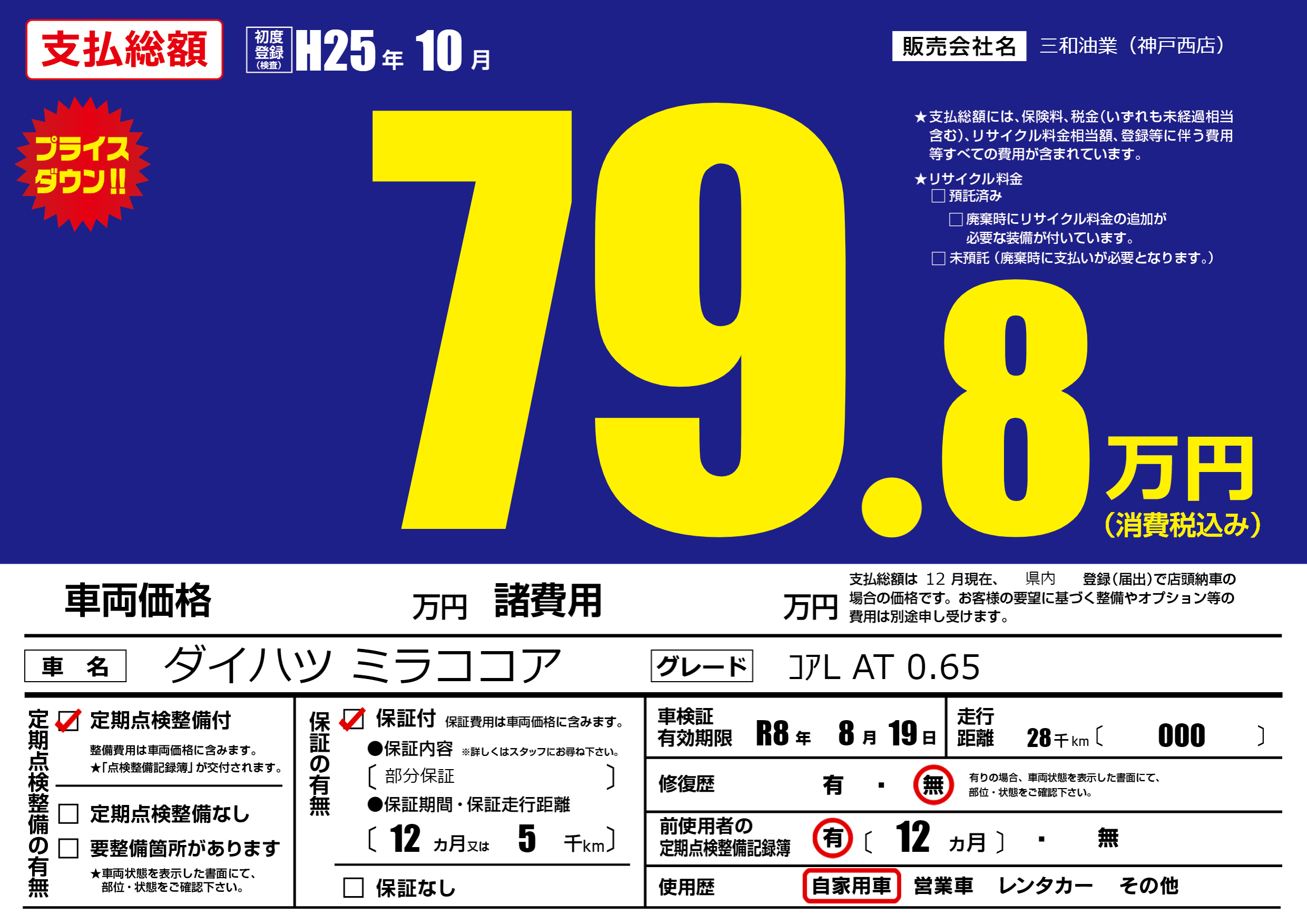 | 走行キロ | 2.8万km | 初年度登録 | H25年10月 |