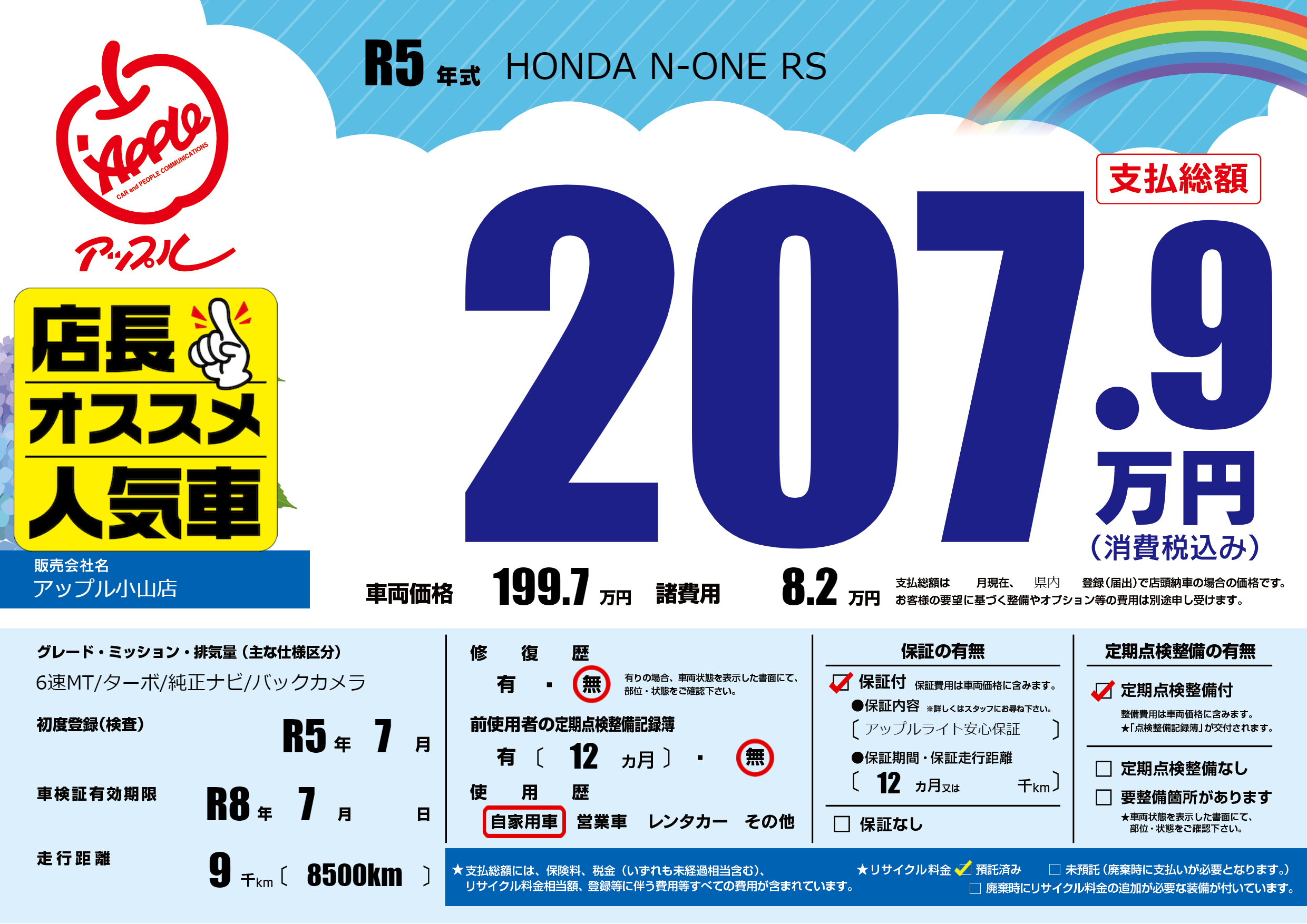 | 車名 | HONDA N-ONE RS | グレード ミッション 排気量 |