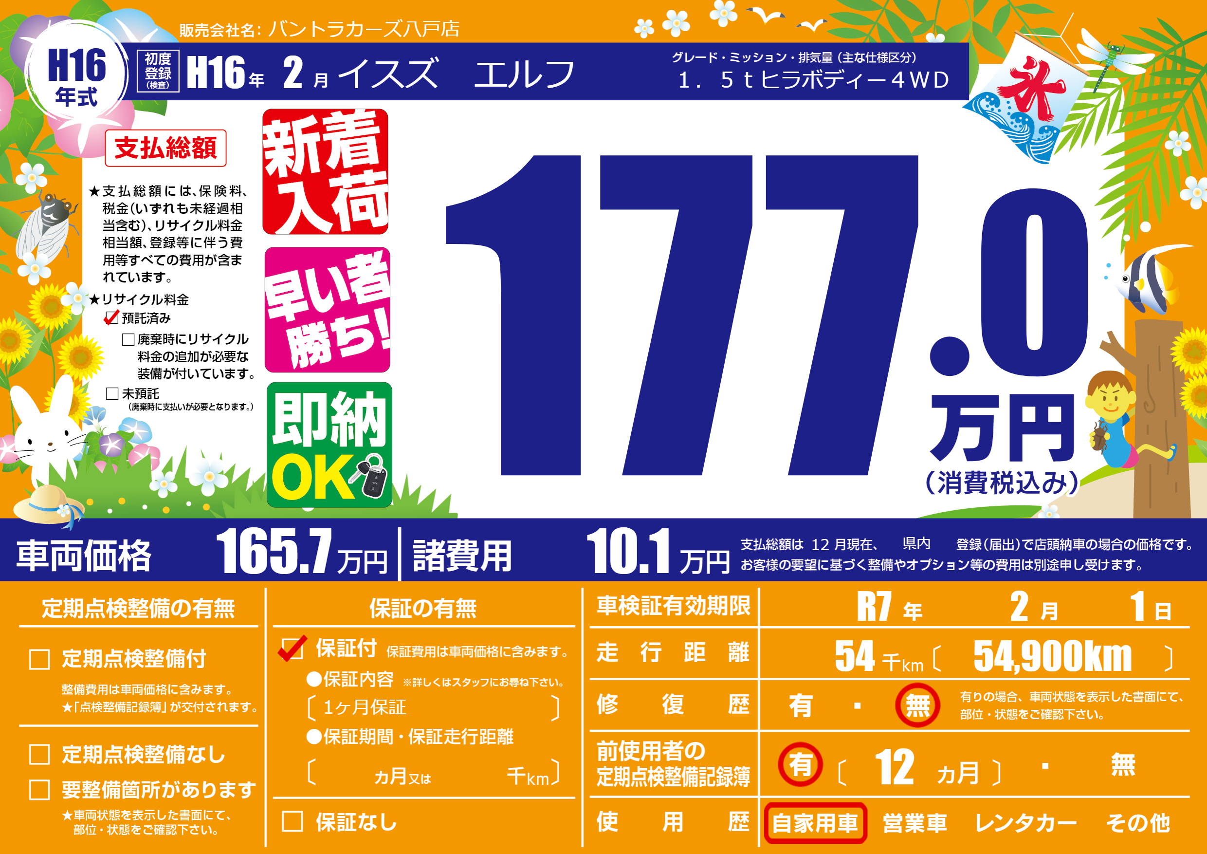 | 走行キロ | 5.4万km | 初年度登録 | H16年2月 |