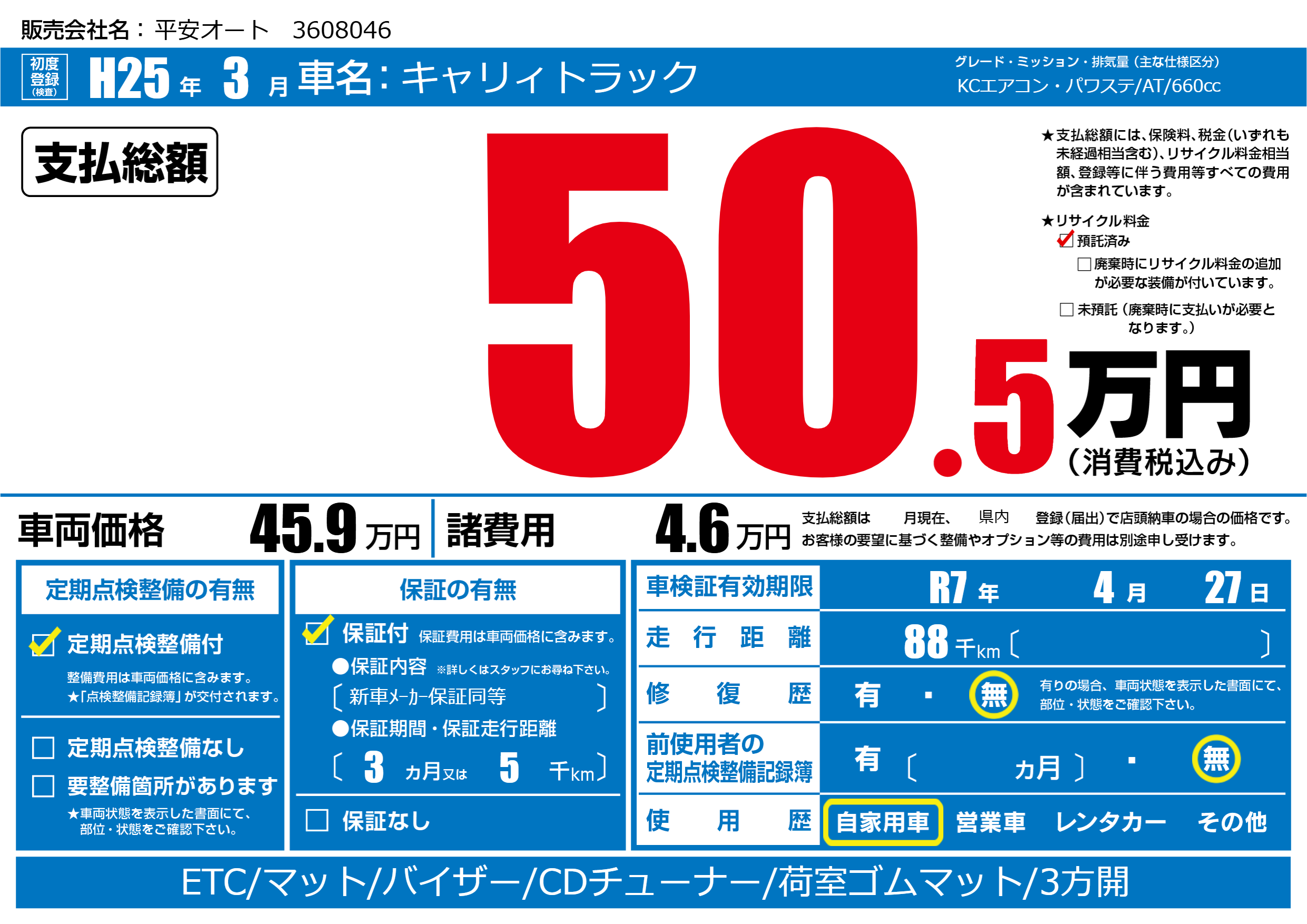 なし | 車検制限 | R7年4月27月 |