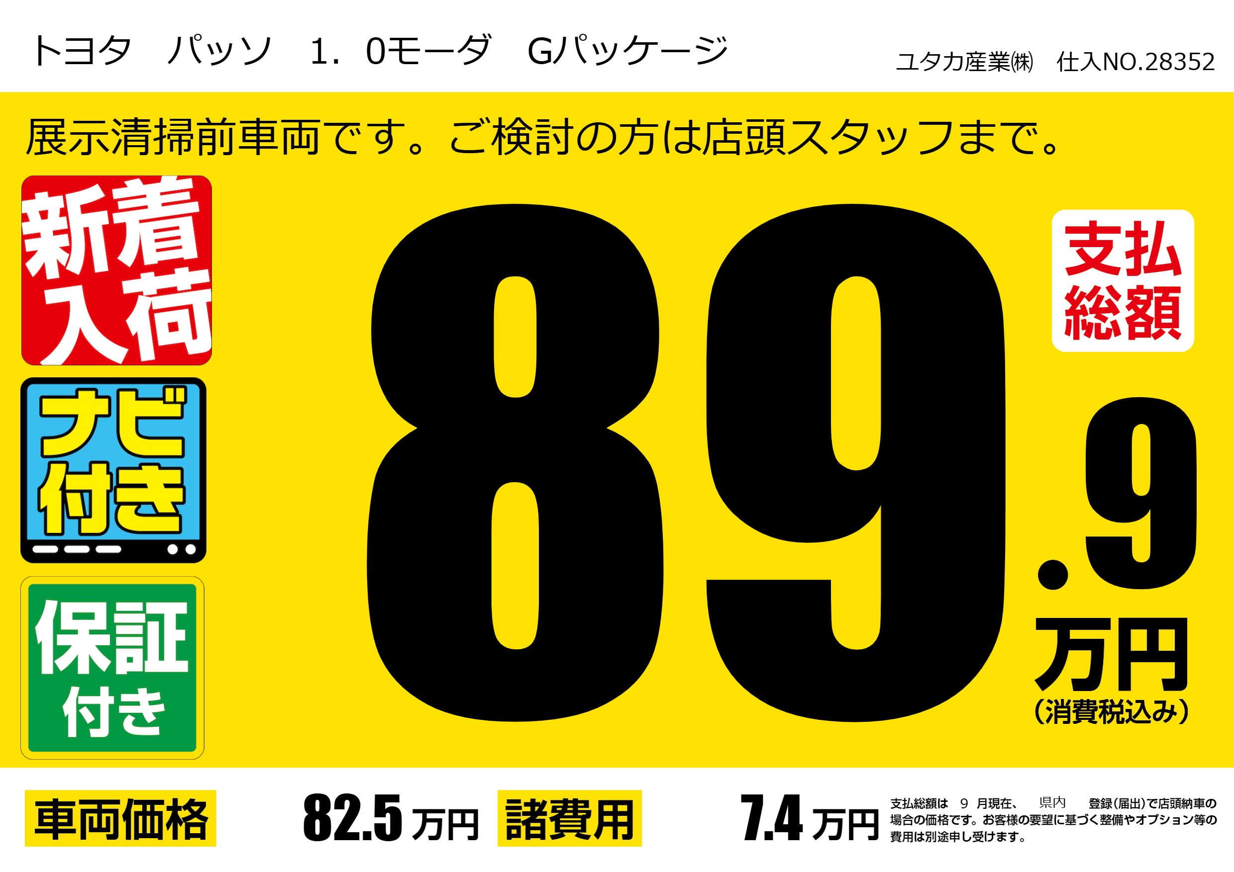 | 車名 | トヨタ パッソ 1.0モーダ Gパッケージ | グレード ミッション 排気量 |