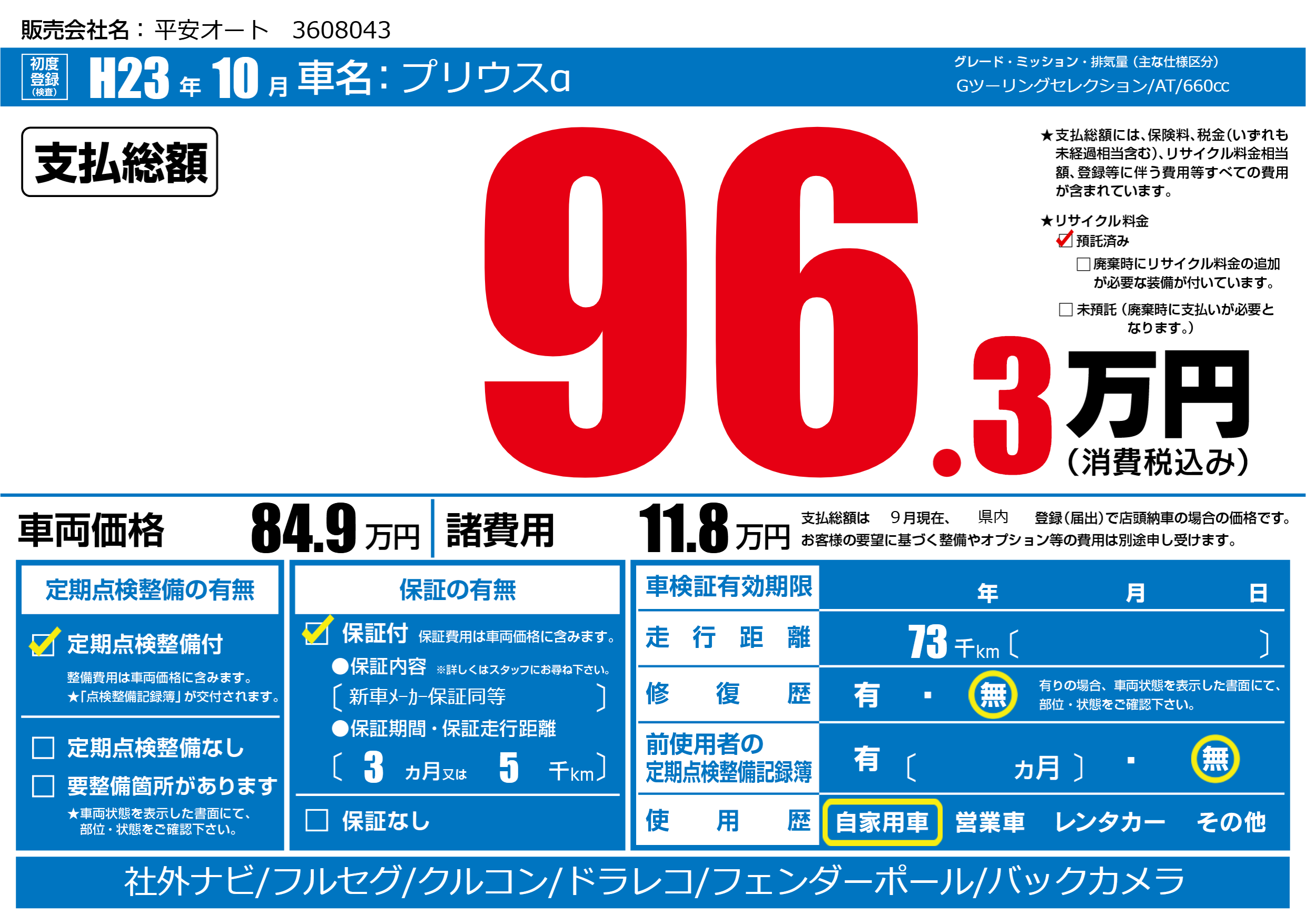 | 走行キロ | 7.3万km | 初年度登録 | H23年10月 |